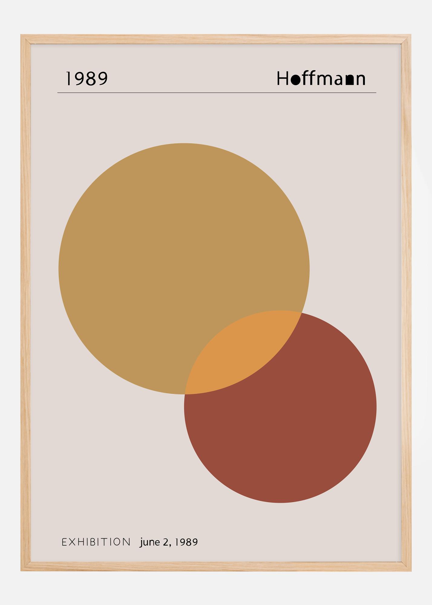 Šis minimalistinis ir rafinuotas plakatas pagerbia abstrakčiojo menininko Hoffmanno parodą iš 1989 metų. Su elegantišku dizainu, kuriame persidengia šilti rudos ir ochros tono apskritimai, šis plakatas sukuria tiek retro, tiek modernumo jausmą. Tekstas diskretiškai išdėstytas, kad suteiktų erdvės vizualumui, kur kiekvienas elementas kruopščiai subalansuotas, kad sukurtų emocingą ir viliojantį meno kūrinį.