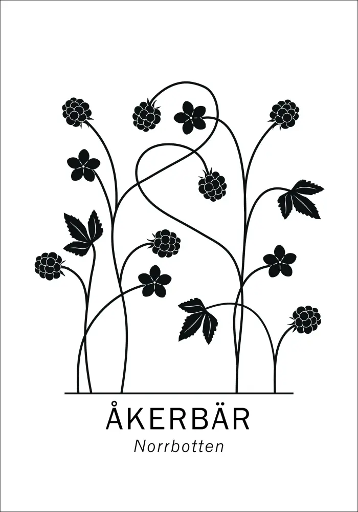 Stilizuotas plakatas su juodai atspausdintomis gervuogėmis. Kelios stilizuotos gervuogių gėlės ir lapai banguoja šiame paprastame juodai baltame spaudoje. Žodžiai Gervuogės Norrbotten yra apačioje paveikslo, kuris puikiai tiktų spalvingai sienai suteikiant dar daugiau gyvumo.