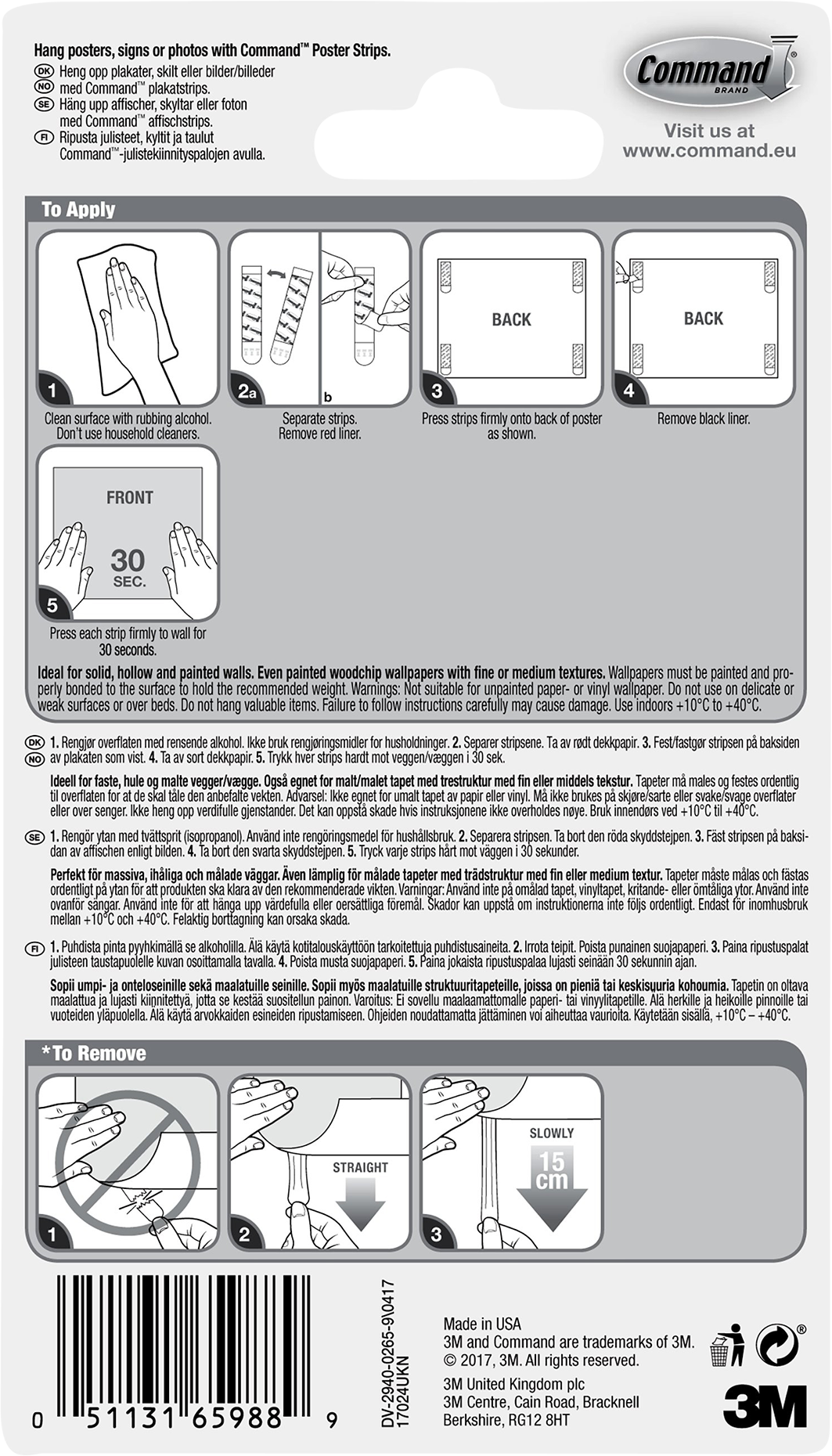 Command Poster Strips yra greitas ir patogus sprendimas saugiam plakatų, kalendorių ir kitų lengvų daiktų kabėjimui. Kabinimo juostelės lengvai tvirtinamos prie sienos ir gali būti naudojamos ant daugumos lygių paviršių, pavyzdžiui, dažytų sienų, dažytų tapetų, plytelių, metalo ir medžio. Jos neturėtų būti naudojamos ant nedažytų tapetų, vinilinių tapetų ar jautrių paviršių.