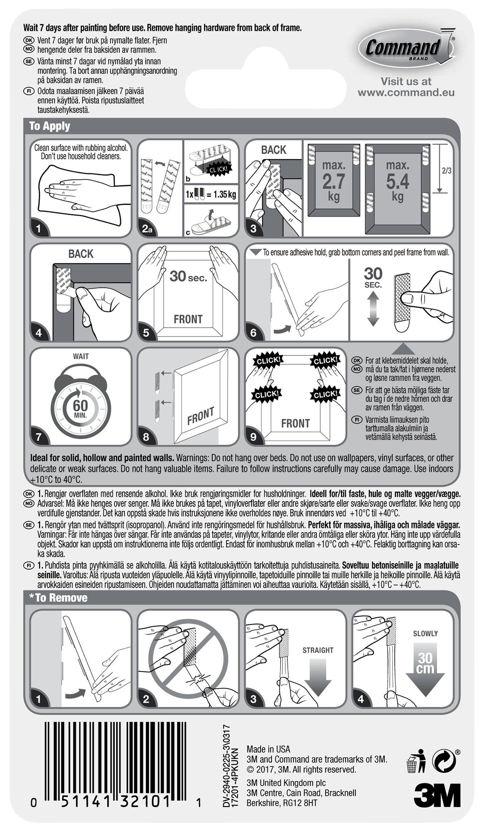Su šiomis Command paveikslų laikikliais galite lengvai pritvirtinti savo nuotraukų rėmelius be gręžimo ar skylių darymo sienoje. Laikikliai yra lipnūs ir nepalieka jokių žymių pašalindami, dėka inovatyvios 3M tempimo-atskyrimo technologijos. Jie puikiai tinka naudoti ant daugumos lygių paviršių, tokių kaip dažytos sienos, plytelės, metalas ir mediena. Laikymo juostos neturėtų būti naudojamos ant tapetų, vinilo medžiagų ar kitų jautrių paviršių.