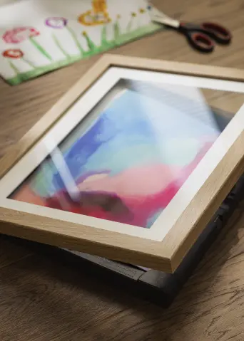 Kai kurie iš mūsų paveikslo rėmų turi vadinamąją float stiklo, kuris yra lygesnis nei „įprastas“ stiklas, su geresnėmis šviesos savybėmis ir taip pat siūlo 45% apsaugą nuo kenksmingo UV apšvietimo. Tada turime pleksiglasą, kuris yra skaidraus akrilo plastiko forma, primenanti stiklą. Galiausiai siūlome paveikslo rėmus su antirefleksiniu stiklu. Šis stiklas yra apdorotas siekiant sumažinti atspindžius, kurie gali leisti motyvui „dingti“, kai jis blykstamas.