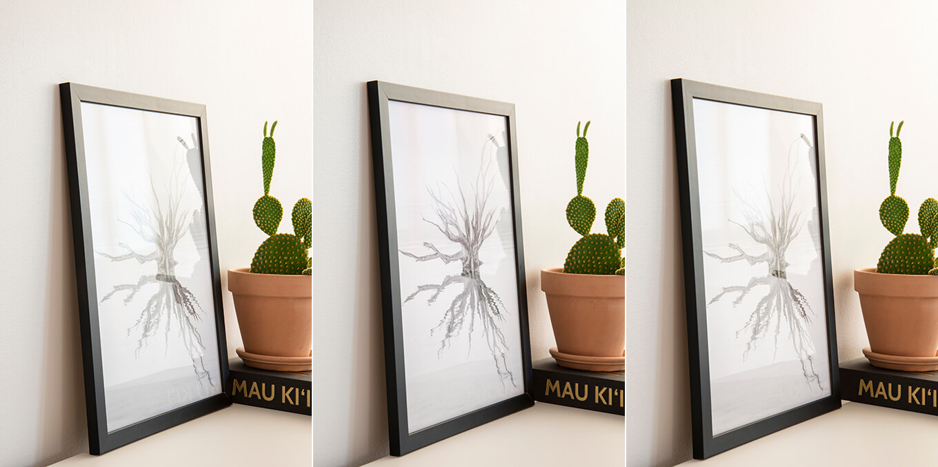 Antirefleksinis stiklas kainuoja šiek tiek daugiau, tačiau yra labai populiarus pasirinkimas. Jei nenori investuoti į tokį stiklą visiems paveikslams, rekomenduojame jį naudoti tiems, kurie kabės vietose su stipriu apšvietimu, arba tiems, kurie tau yra itin svarbūs ir kuriuos nori gerai apsaugoti ir aiškiai matyti.