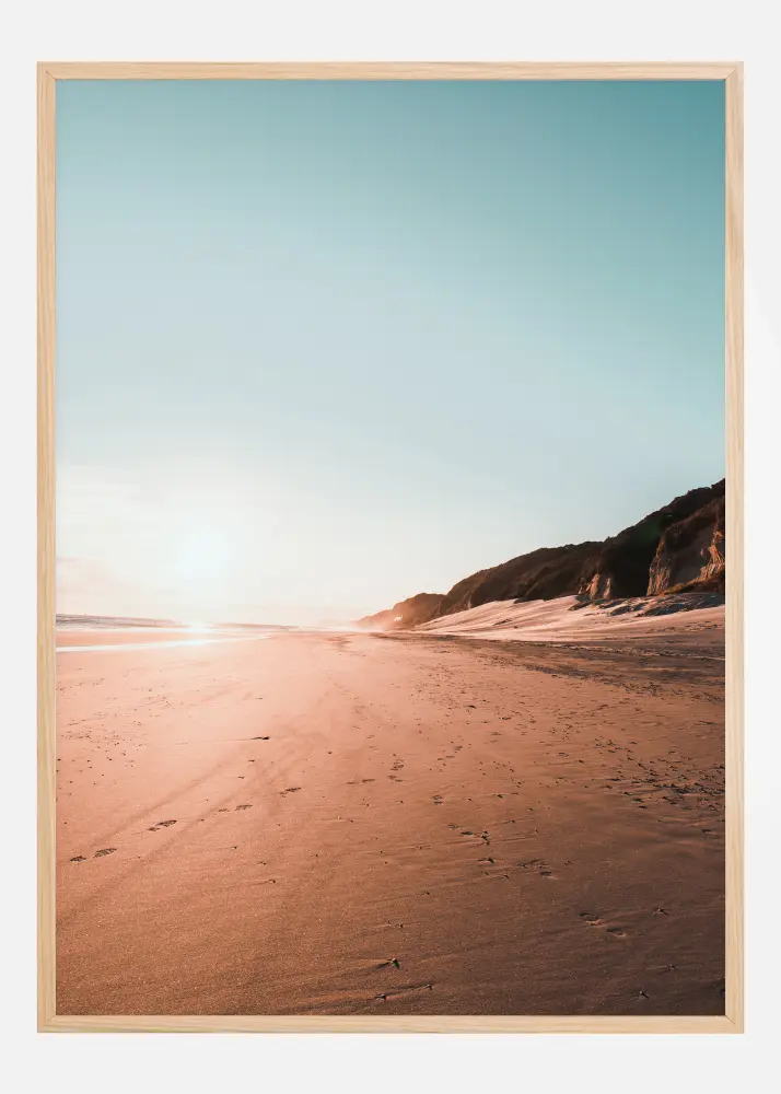Peizažo plakatas su nuostabia paplūdimio ruožu su smėlio kopomis ir mėlynu dangumi. Paplūdimys tęsiasi tolyn, kur šviesi saulė stovi prie horizonto ir pritraukia žvilgsnį, kai ji spindi smėlyje. Įsivaizduokite save, kad tai jūs paliekate šiuos pėdsakus smėlyje, kol parsinešate šį vaizdą namo.