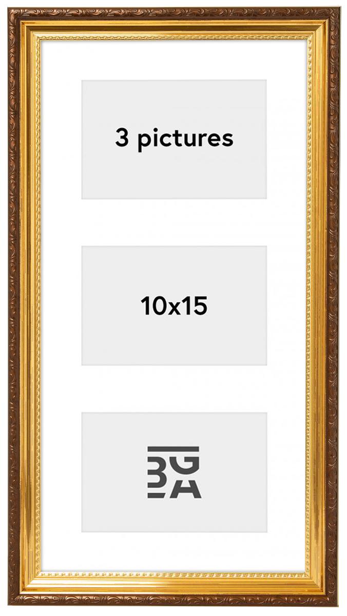 Su šiuo koliažiniu rėmeliu galite papuošti savo sieną šeimos, draugų nuotraukomis ir gyvenimo puikių akimirkų prisiminimais. Rėmelyje telpa 3 nuotraukos, kurių dydis yra 10x15 cm. Auksinės spalvos rėmas turi gražų retro stilių su dekoratyvine išore šiltai rudos spalvos. Yra sieninis tvirtinimas.