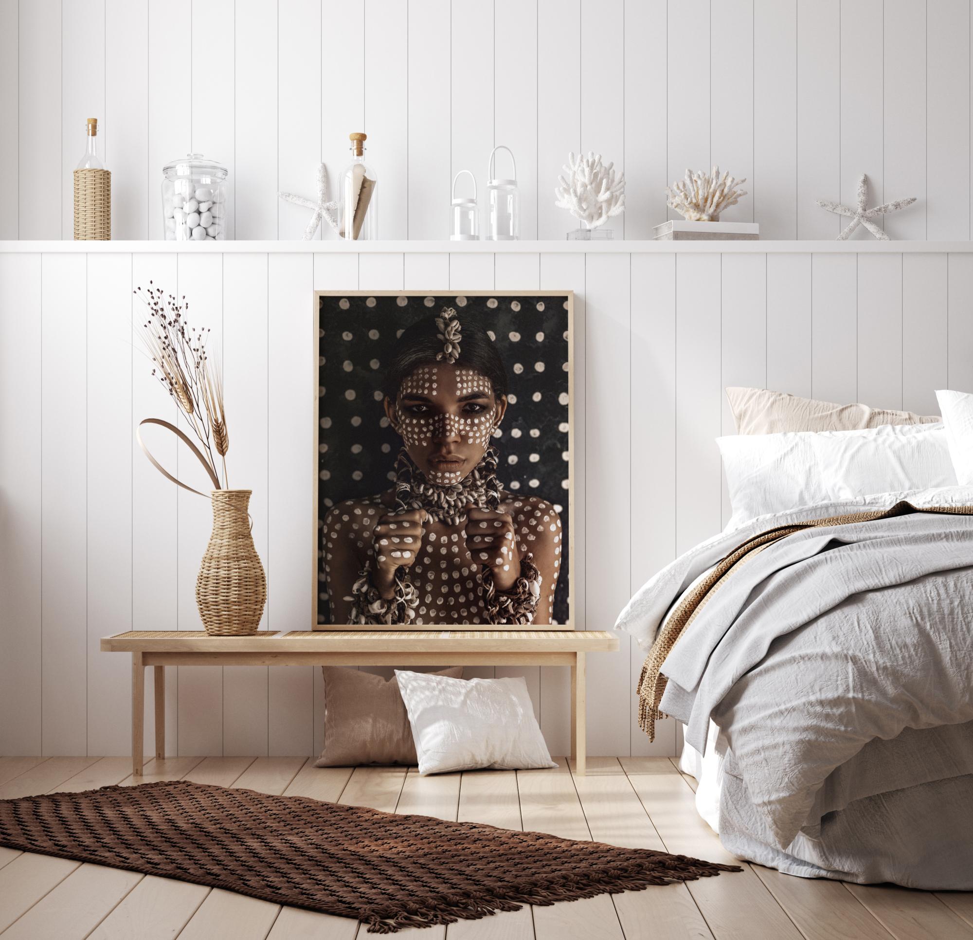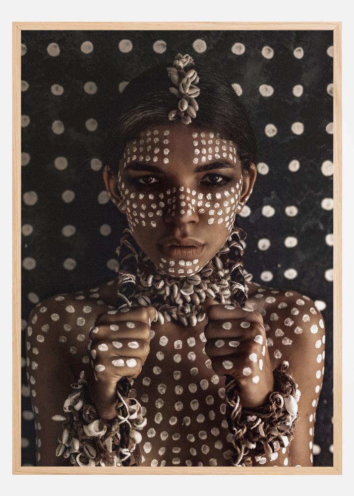 Čia jus pasitinka tvirtas jaunos aborigenės žvilgsnis su baltais kūno dažais ir gražiais papuošalais iš natūralios virvės ir kriauklių. Žemiška fotografijos meno plakatė, kuri puikiai tinka tiek vienumoje, tiek ant modernaus sieninio paveikslų derinio.