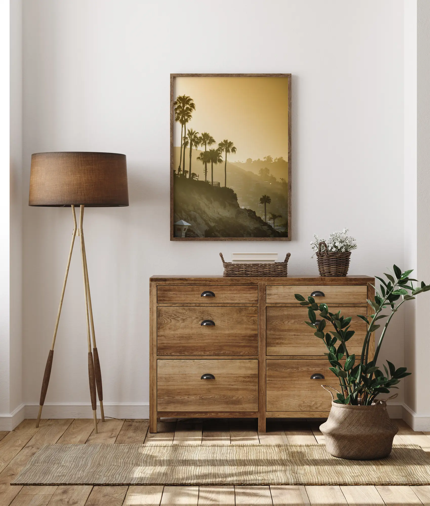 Nuostabus plakatas su palmėmis ant kalvos šlaito, žvelgiančiomis į senovinį miestą. Sepijos tonai užfiksuoja miglotą rytinę šviesą, kai saulė kyla už kalvų ir apšviečia sceną. Plakatas sukelia šilumos ir ramybės jausmą, puikiai tinkantį jaukiam kampeliui namuose.