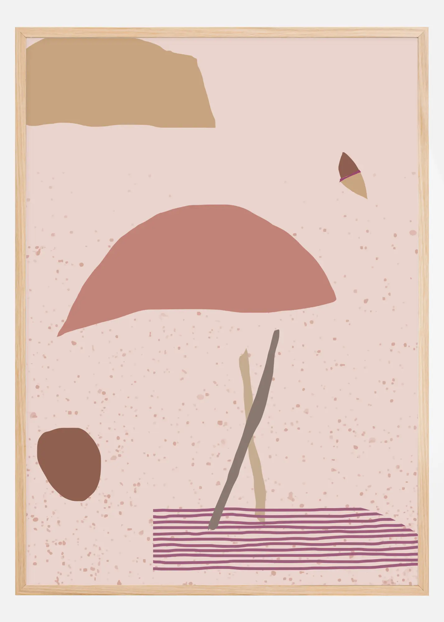 Abstraktus plakatas su raudonomis, smėlio spalvos, rausvomis ir violetinėmis formomis ant švelnaus margumo fono. Mėgaukitės raminančiu formų poveikiu ir pagalvokite, ką tai reiškia, kai matote rutulį, debesies formą, lazdas, kilimėlį arba skėtį kūrinyje. Švelnios tonai idealiai tinka, pavyzdžiui, vonios kambario sienai.