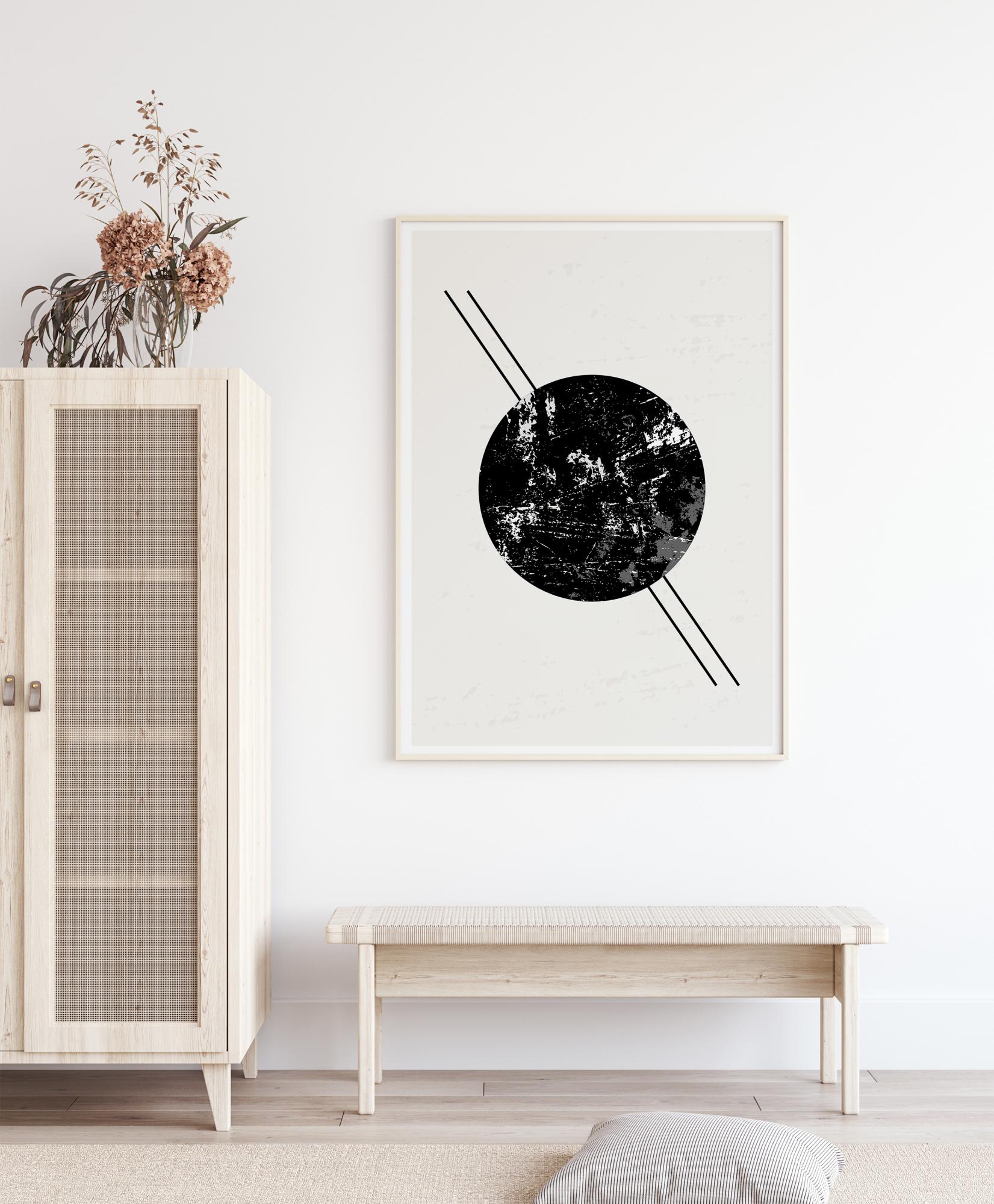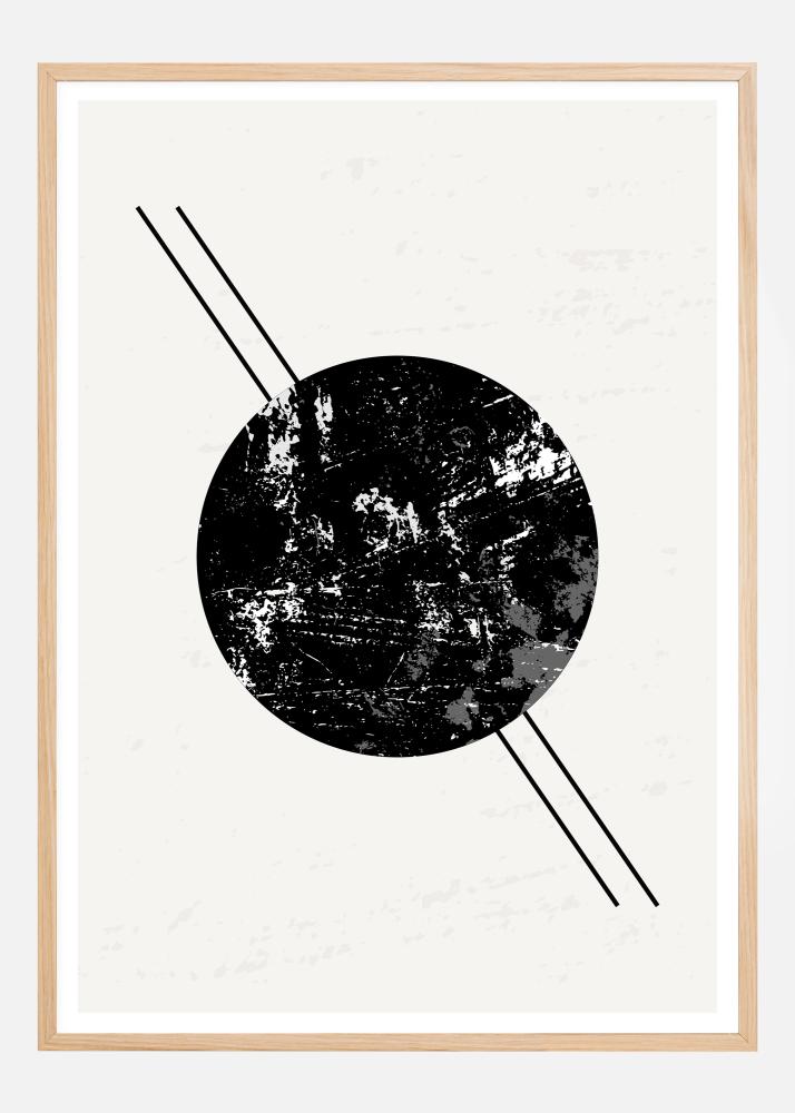 Stipri abstrakti plakatas su juodu apskritimu su dviem linijomis, besitęsiančiomis nuo viršutinio kairiojo kampo iki apatinio dešiniojo kampo. Juodajame apskritime yra baltais ir pilkais marmuro efektas, kur du juodi ruožai beveik sukuria Saturno žiedus. Parsineškite šį kūrinį namo ir pamatykite visas šio apmąstymo meno kūrinio galimybes.