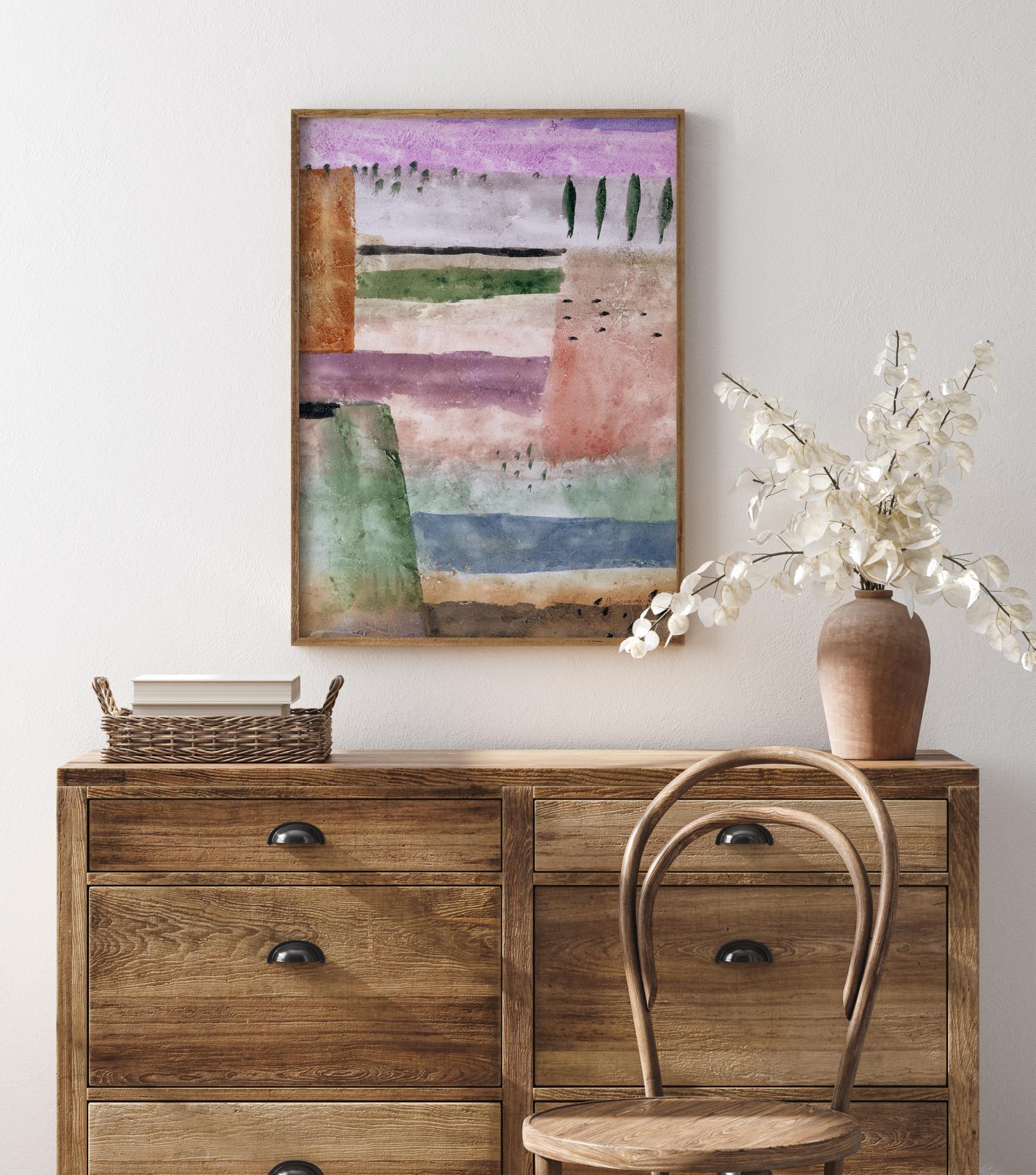 Pastelinėmis spalvomis abstraktus plakatas su sluoksniuotu, tekstūriniu pojūčiu. Plakate vaizduojama tai, kas atrodo kaip paplūdimys, jūra, kalnai, žolė ir medžiai, tolstantys į tolį. Yra keli mėlyni, violetiniai, oranžiniai ir žali laukai švelniomis pastelėmis. Ši rami scena ramina protą.