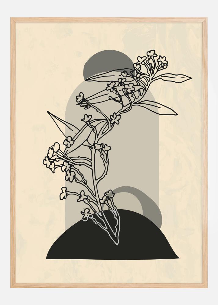 Šis rafinuotas plakatas vaizduoja abstraktų žiedyną, derinantį gamtines formas su grafiniais elementais, suteikiančiais šiuolaikinį pojūtį. Motyvas naudoja subtilią spalvų paletę su švelniais smėliniais tonais ir drąsiomis juodomis linijomis, suteikdamas kontrastą, kuris yra ir akį traukiantis, ir elegantiškas. Dizainas akcentuoja kompoziciją ir pusiausvyrą, o organinės gėlių ir lapų formos išdėstomos virš tvirtos juodos puslankio, sukuriant šešėlio ir gylio iliuziją.