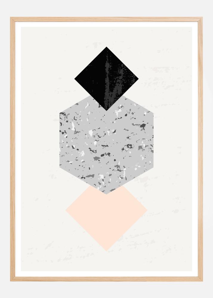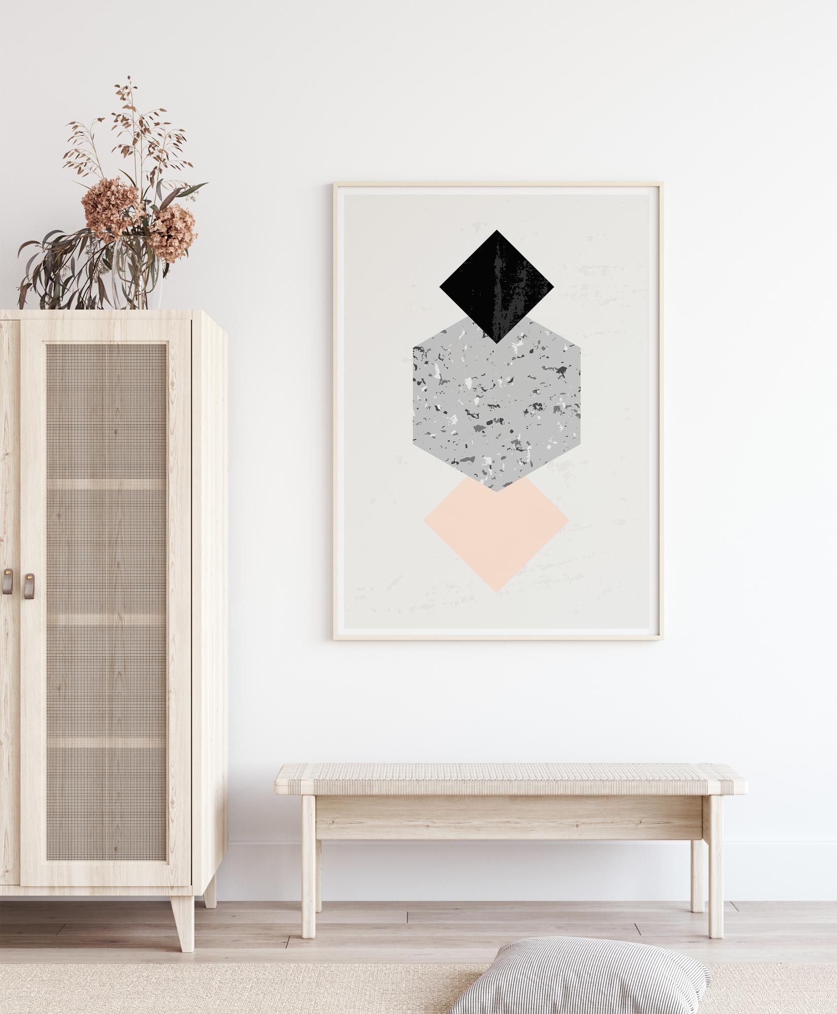 Geometrinis abstraktus plakatas su dviem skirtingais kvadratais. Nors jie yra dviejų dimensijų, kvadratų kampai suteikia kubų iliuziją. Šie kubai užpildyti linksmais akmenėliais ir spalvotais taškais mėlynos, pilkos ir juodos spalvos. Sukurkite dramatišką sieną, kai šią paprastą dalį derinsite su ryškiai spalvota siena.