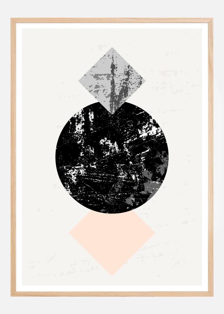 Geometrinė abstrakti afiša su dviem kvadratais, kurie supa apskritimą. Juodas apskritimas turi baltą marmurą ir yra flankiruojamas mėlyno marmurinio kvadrato ir rožinio kvadrato. Kiekviena vieta yra įrengta taške, kuris fokusuoja akį į viduryje esantį žemės formos apskritimą. Suteikite dramą paprastai sienai su šiuo išraiškingu meno kūriniu.