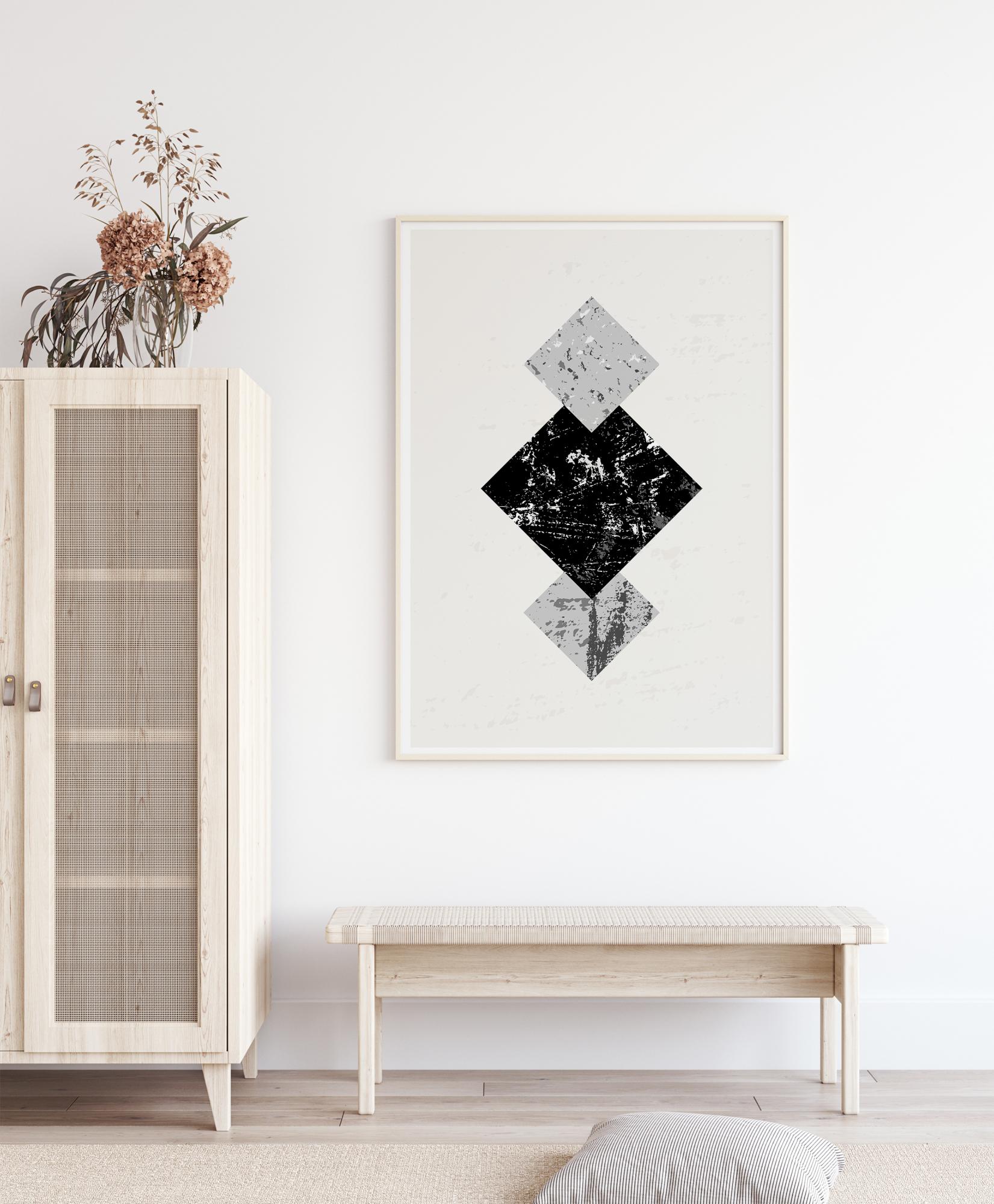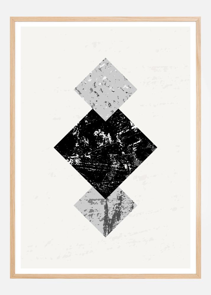 Geometrinis plakatas su trimis kvadratais, esančiais balto fono viduryje. Didelis kvadratas viduryje yra juodas su marmuro efektais. Kiekvienoje pusėje yra du mažesni mėlyni kvadratai su marmuro ir žvyro efektais. Akis traukiama per kūrinį naudojant taškus kiekviename kvadrate šiame beveik simetriškame kūrinyje.
