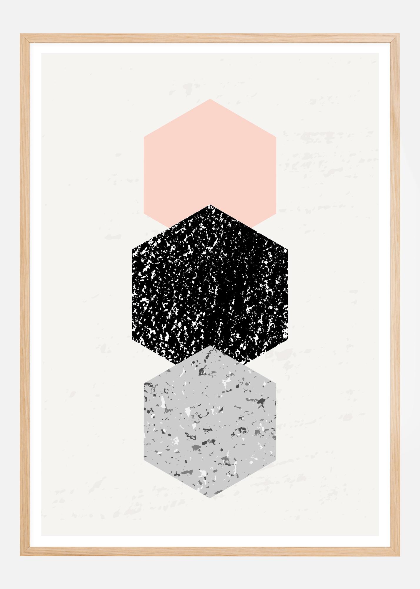 Abstraktus plakatas su šešiakampiais, trimis vienas ant kito uždėtais šešiakampiais. Viršutinis yra švelniai rožinis, viduryje didesnis - juodai baltas dėmėtas, o apatinis - mėlynas marmurinis šešiakampis. Akis praeina per šį kūrinį, be trikdžių, puikiai tinka namų biurui.