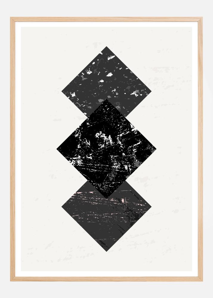 Geometrinis plakatas su trimis tamsiais kvadratais, stovinčiais ant savo viršūnių. Du tamsiai mėlyni kvadratai yra virš ir po didesniu juodu kvadratu. Visi pabrėžti baltais taškais ir dėmėmis, kurios sukuria įdomų raštų derinį. Derinkite šį meno kūrinį su mėlyna siena ir leiskite formoms išsiskirti.