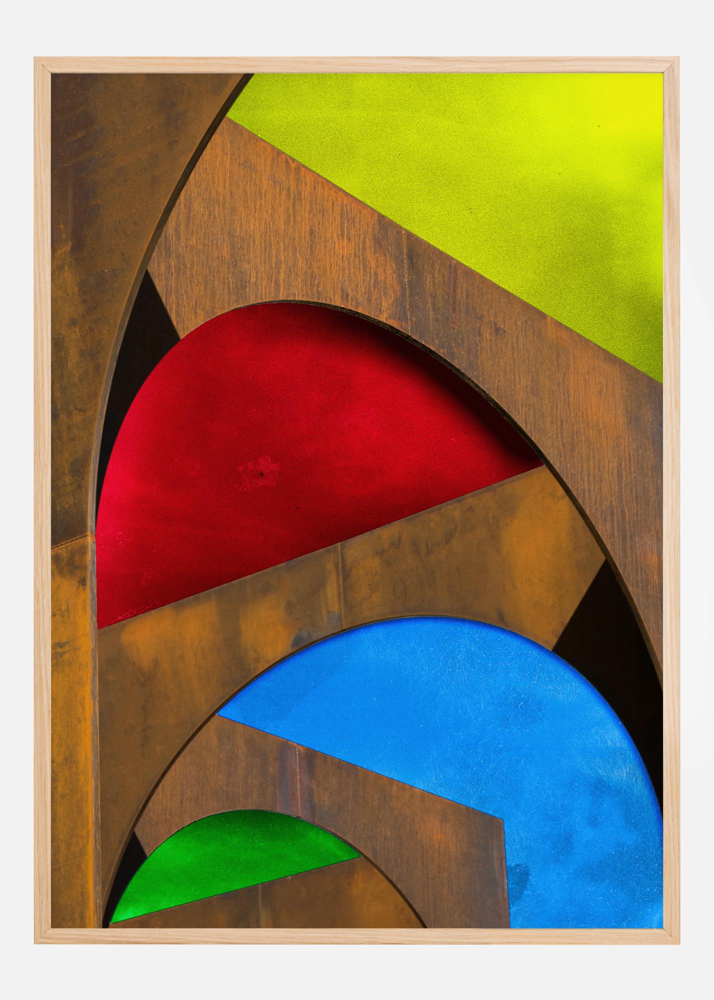 Šviesi abstrakti afiša su spalvotomis formomis. Pagrindinės spalvos užpildo šį kūrinį raudonais, geltonais ir mėlynais pusapvaliais. Šios formos sujungiamos su tiesiais medžio kirčiais prie juodo fono. Atgaivinkite nuobodžią ir lygią sieną arba suderinkite su kita esama ryškia spalva, kad papildytumėte kūrinį.