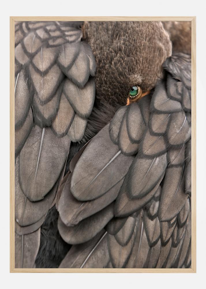 Šis įspūdingas plakatas užfiksuoja intymumo akimirką gamtoje, kai stambiu planu matoma paukščio akis, kurios šviesiai žalia spalva spindi kaip smaragdas, įsiterpęs tarp plunksnų pilkų atspalvių. Kiekviena plunksna yra tiksliai išraižyta, sukuriant paukščio elegantiškos formos ir struktūros jausmą. Tai kūrinys, kuris kalba tiek paukščių mėgėjams, tiek menininkams, bei tiems, kurie vertina subtilų gamtos grožį.