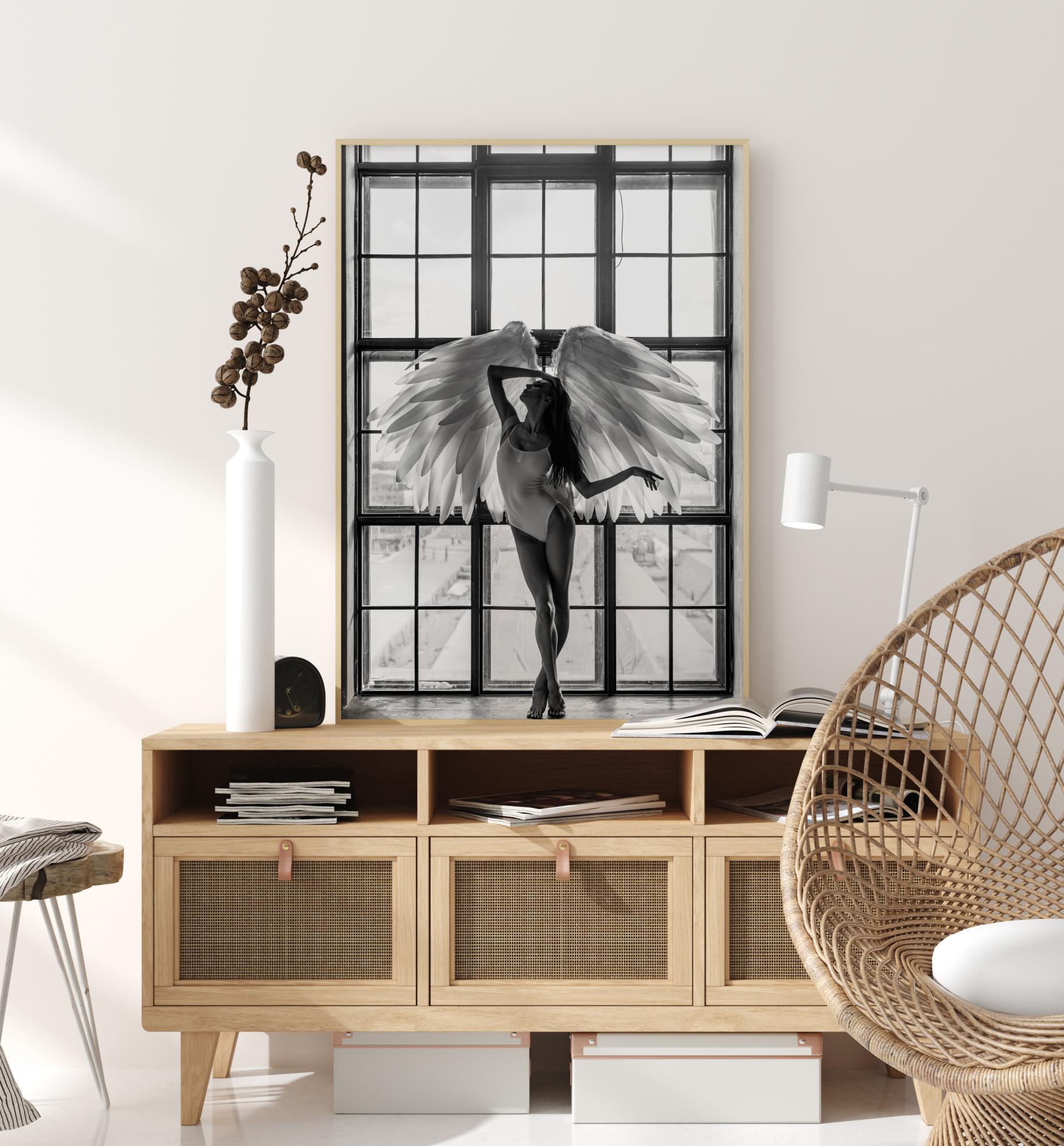 Graži fotografijos meno plakatas tamsiai pilkų atspalvių moteriai, pozuojančiai dideliame lange, vilkinčiai bodį ir didelius, gražius angelo sparnus. Plakatas, kurį lengva derinti su kitais mėgstamiausiais, bet kuris taip pat puikiai tinka kaip vienintelis akcentas.