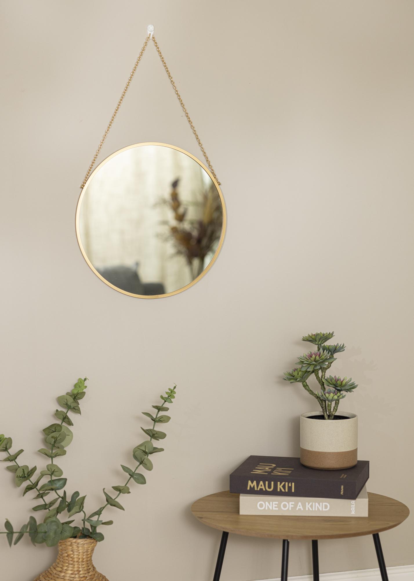 Leiskite šiam sienos veidrodžiui suteikti elegancijos jūsų namams! Veidrodis turi rafinuotą išvaizdą su apvalia forma ir plonu veidrodžio rėmeliu, kurio gylis tik 8 mm. Plonas rėmelis yra pagamintas iš metalo ir turi išskirtinę aukso spalvą. Elegantišką įspūdį papildo auksinė grandinėlė, naudojama pakabinimui.