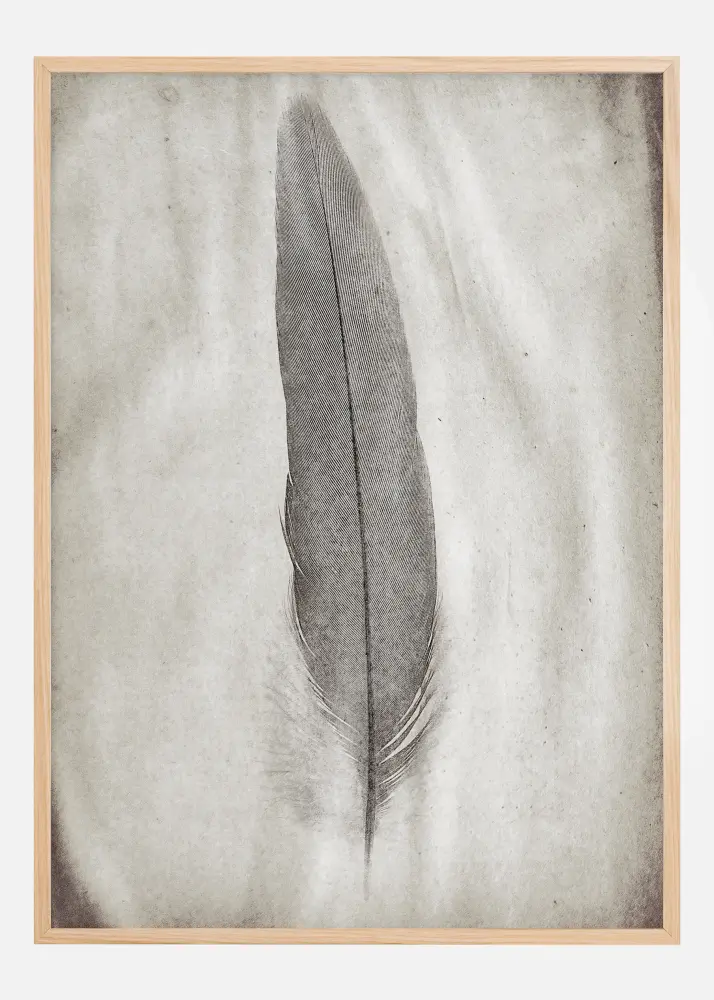 Šis plakatas yra subtili, bet išraiškinga duoklė gamtos grožiui, perteikta per vienintelio plunksnos vaizdą. Jo detali struktūra ir minkštos kontūrai traukia dėmesį ir sukuria ramią, bet įtraukiančią vizualinę fokusuotę bet kuriame kambaryje. Printas suteikia lengvumo ir ramybės pojūtį, o neutrali spalvų paletė daro jį universaliu interjero elementu, kuris gali papildyti skirtingus kambarius ir stilius.