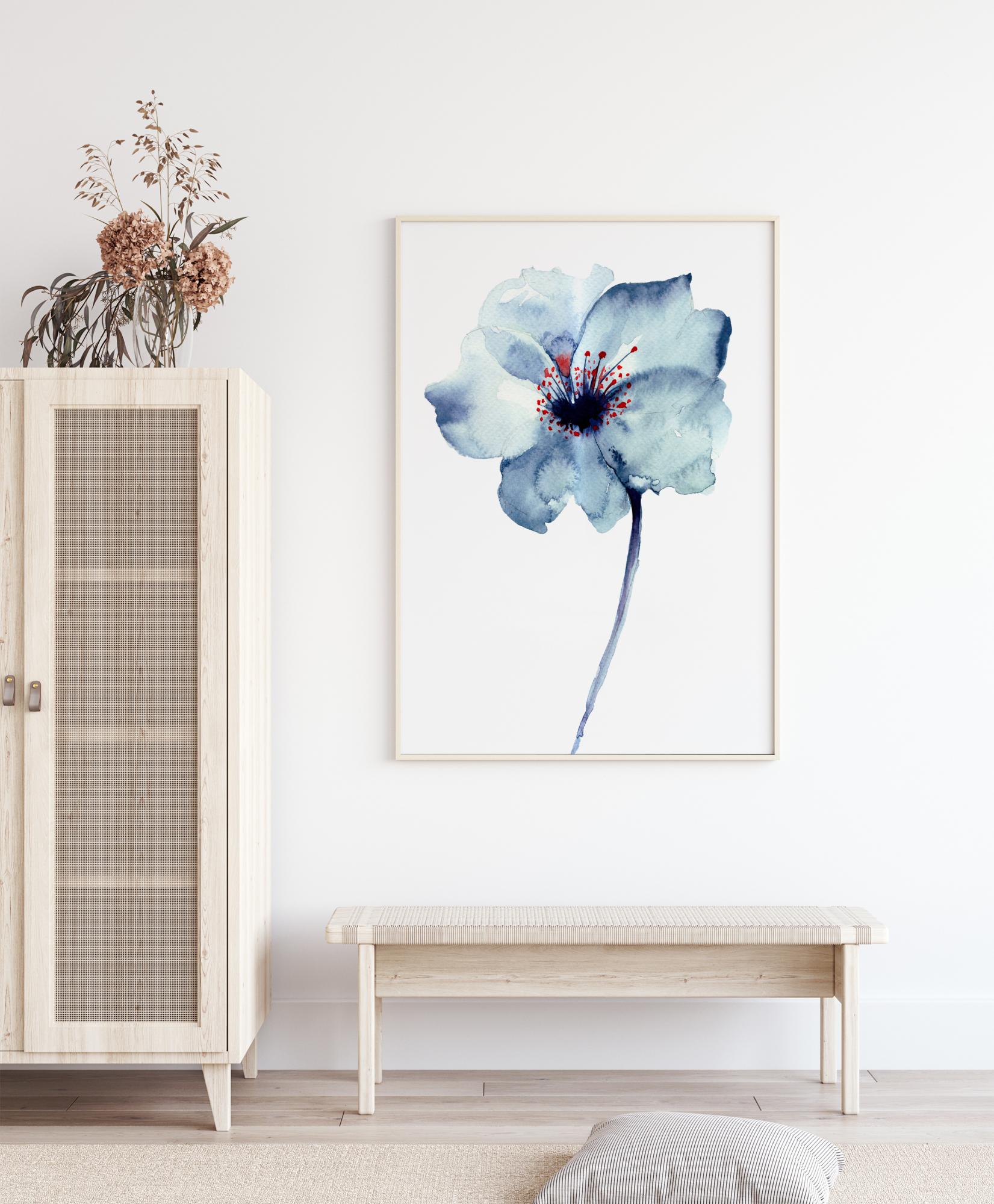 Įspūdinga gėlė, nupiešta mėlyna ir raudona akvarele. Gražus plakatas, visoje savo paprastume, kuris vienodai tinka virtuvėje, hole, svetainėje ar miegamajame.