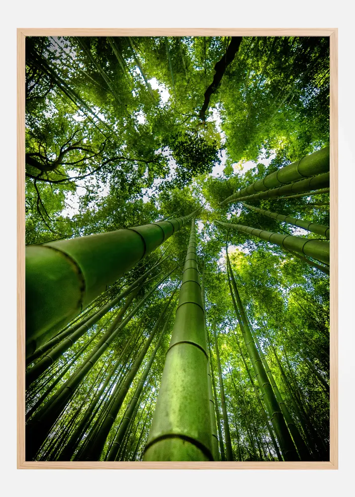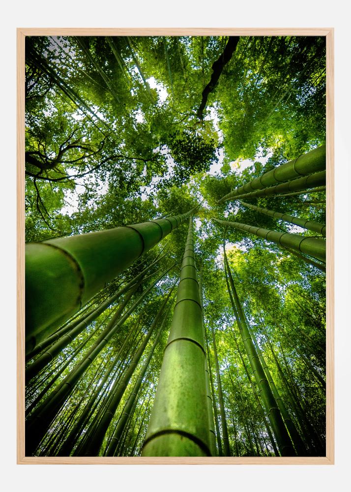 Gamtos plakatas su žaliais bambukais. Pažvelkite į dangų, kai šis vaizdas yra apsuptas storų bambuko stiebų, vedančių į žalią lapų stogą danguje. Įsivaizduokite, kad gulite šioje ramioje džiunglių pasaulyje, kai parsigabensite šį vaizdą į savo namus.