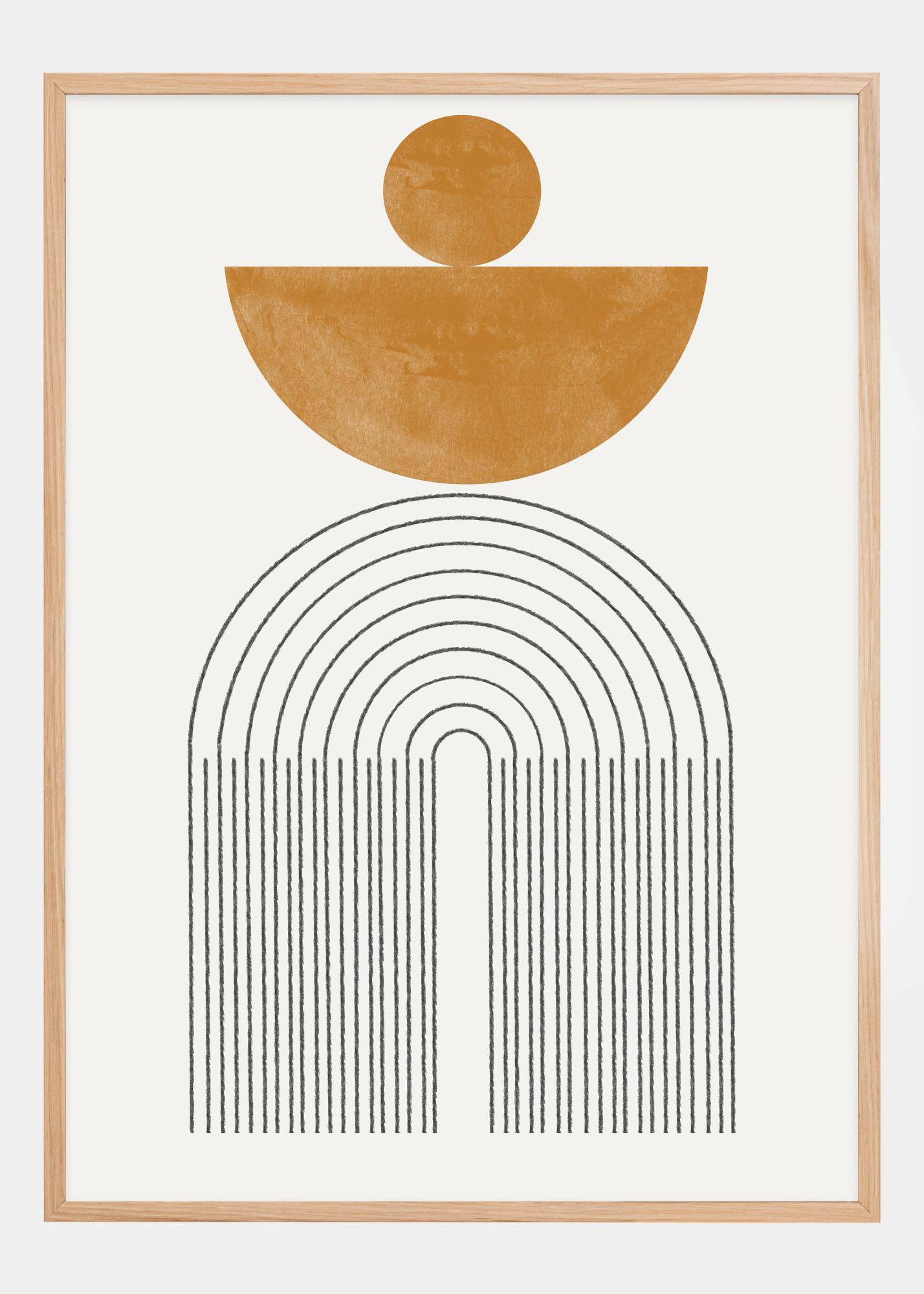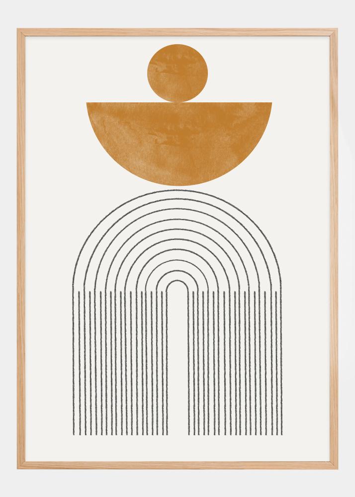 Šis elegantiškas plakatas sujungia organines formas ir švarias linijas į kompoziciją, kuri yra tiek raminanti, tiek vizualiai įdomi. Didelis ochros spalvos puslankis sėdi kaip saulėlydis virš kelių arkų, sukuriant architektūrinį erdvės ir gylio pojūtį. Viršuje dizainą subalansuoja mažesnis apskritimas, primenantis saulės kelią dangumi.