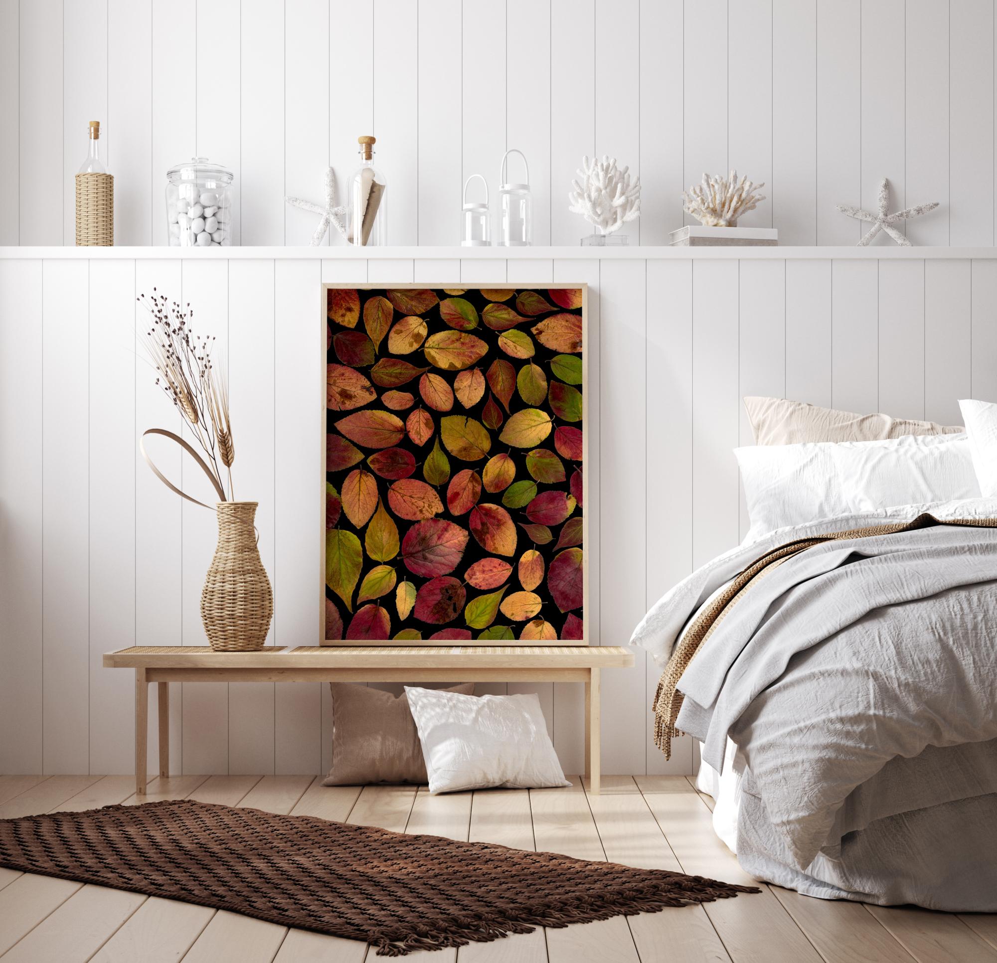 Raštuotas plakatas su rudens lapais. Akį pasiekia vienoje eilėje išdėstytos geltonos, rožinės ir raudonos spalvos šiame organizuotame lapų rinkinyje. Visi lapai susilieja tamsiame fone, suteikdami rudens gyvybingumą šiam plakatui. Puikus spalvos akcentas virtuvėje arba koridoriuje.