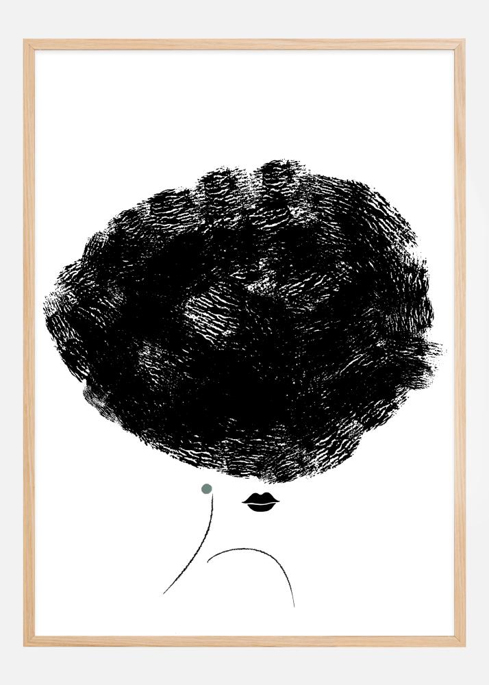 Šis konceptualus plakatas vaizduoja minimalistinį, bet išraiškingą moters profilį, kuriame jos dideli, masyvūs plaukai dominuoja scenoje. Plaukai, pavaizduoti juoda spalva su galingais ir storais teptuko potėpiais, sukuria dramatišką kontrastą su balta fone ir suteikia dinamiško judesio įspūdį, užfiksuotą ramiu momentu. Mažas, diskretiškai žalias taškas, esantis prie ausies, išskaido monokromatinį vaizdą ir prideda subtilų spalvos akcentą. Šis spaudinys pabrėžia esminius formos ir spalvos elementus ir suteikia drąsų, modernų estetinį vaizdą bet kokiai šiuolaikinei erdvei.
