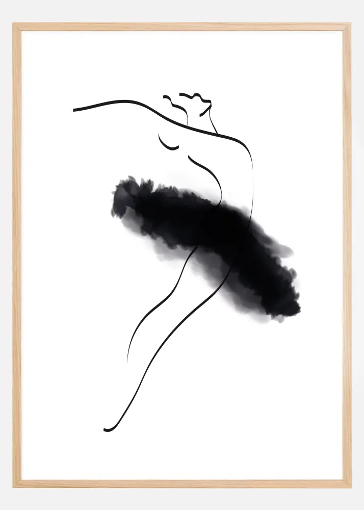 Akvarelė apie baleriną plonomis juodomis linijomis, su ryškesniu juodu balerinos sijonu. Minimalistinis ir elegantiškas plakatas, tinkantis tiek miegamajame ar koridoriuje, tiek svetainėje ar bibliotekoje.