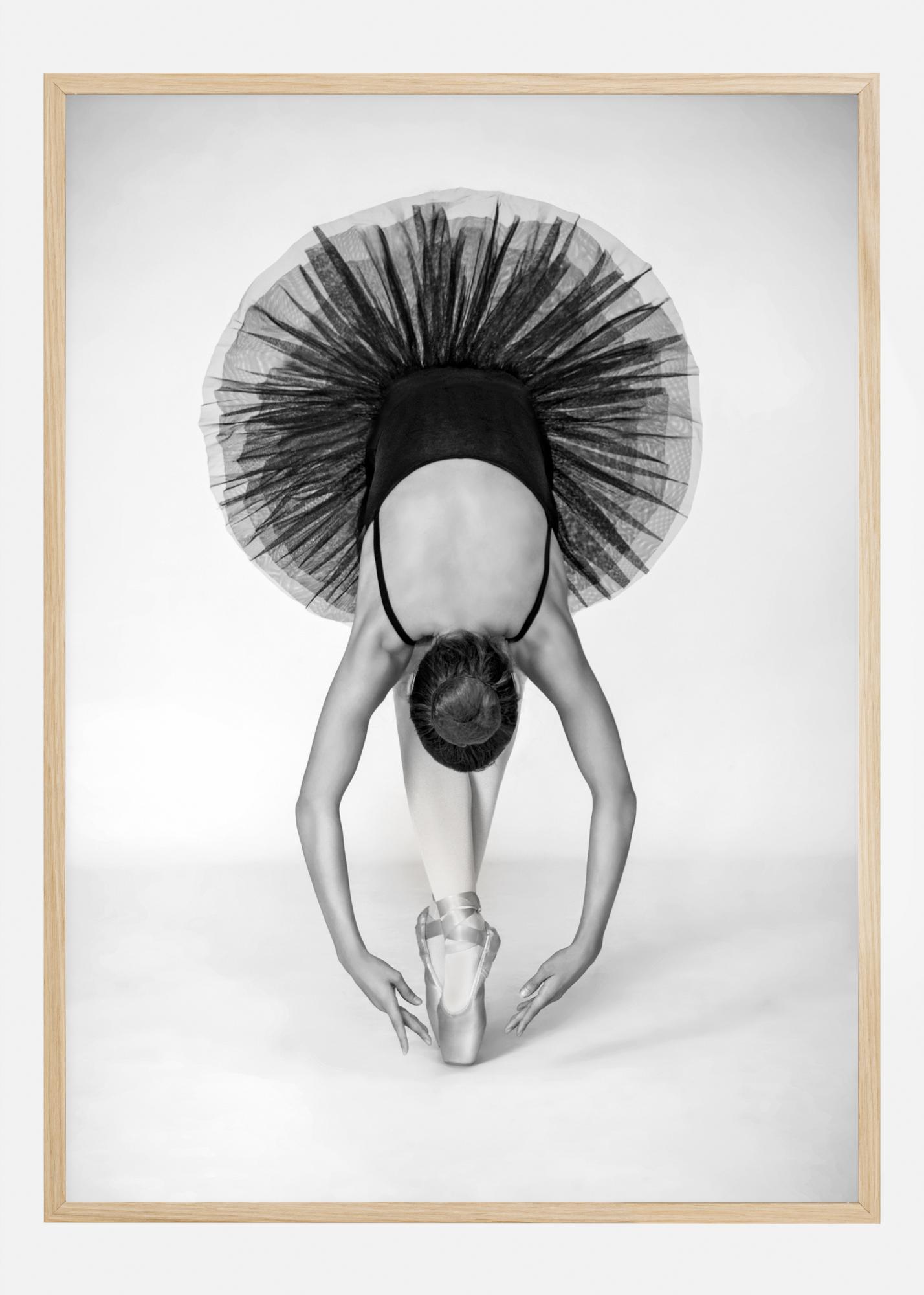 Portreto plakatas su balerina. Ši baleto šokėja lenkiasi pirmyn penktoje pozicijoje ir kuria dvi tobulas apskritas rankų ir juodos tutu pagalba. Juodai balta plakatas išryškina ją ir sukuria elegantišką, klasikinę išvaizdą, kuri pagerina paprastą neutralą sieną bet kurioje namų vietoje.
