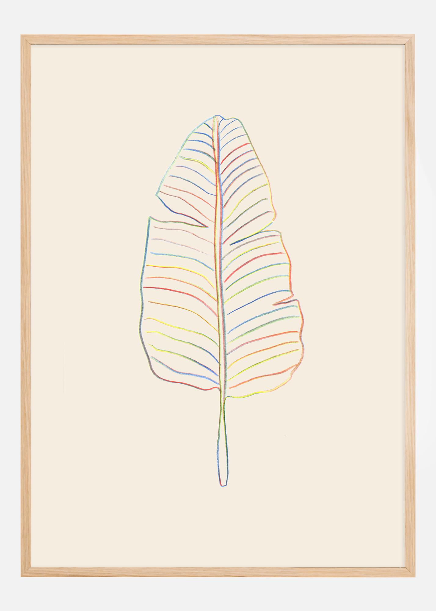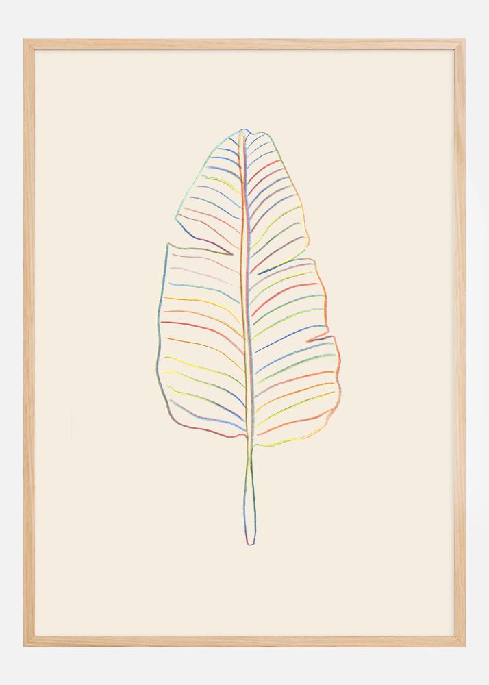 Ši gyvybinga ir spalvinga plakatas vaizduoja kūrybingą banano lapo interpretaciją su linijomis, esančiomis vaivorykštės spalvų spektre. Žaismingas kontrastas tarp lapo natūralių formų ir žaismingų spalvų suteikia šiuolaikišką posūkį klasikinei botanikos menui. Ši spauda yra puikus pavyzdys, kaip klasikiniai motyvai gali būti transformuoti naudojant spalvų akcentus, kad atitiktų modernią estetiką.