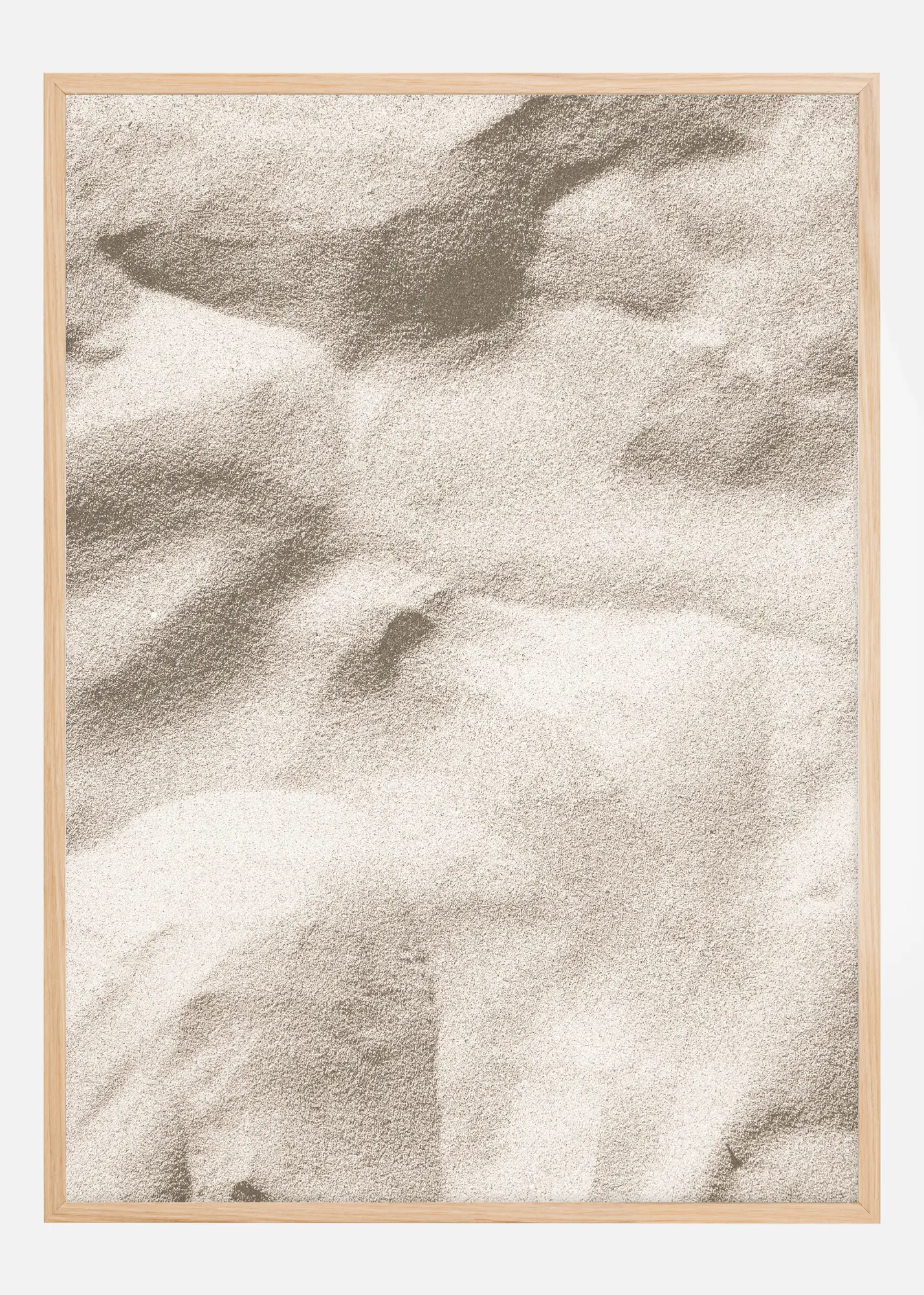 Šis nuosaikus ir meditacinis plakatas užfiksuoja natūralią smėlio kopų tekstūrą ir minkštus kontūrus. Monochrominė nuotrauka žaidžia su šviesa ir šešėliu, siekdama pabrėžti juslines ir trumpalaikes formas, kurias sukuria vėjo judesiai per smėlio paviršių. Švelnios gradacijos nuo šviesos iki tamsos kuria beveik hipnotizuojantį efektą, kuris kviečia apmąstymus ir ramybę.