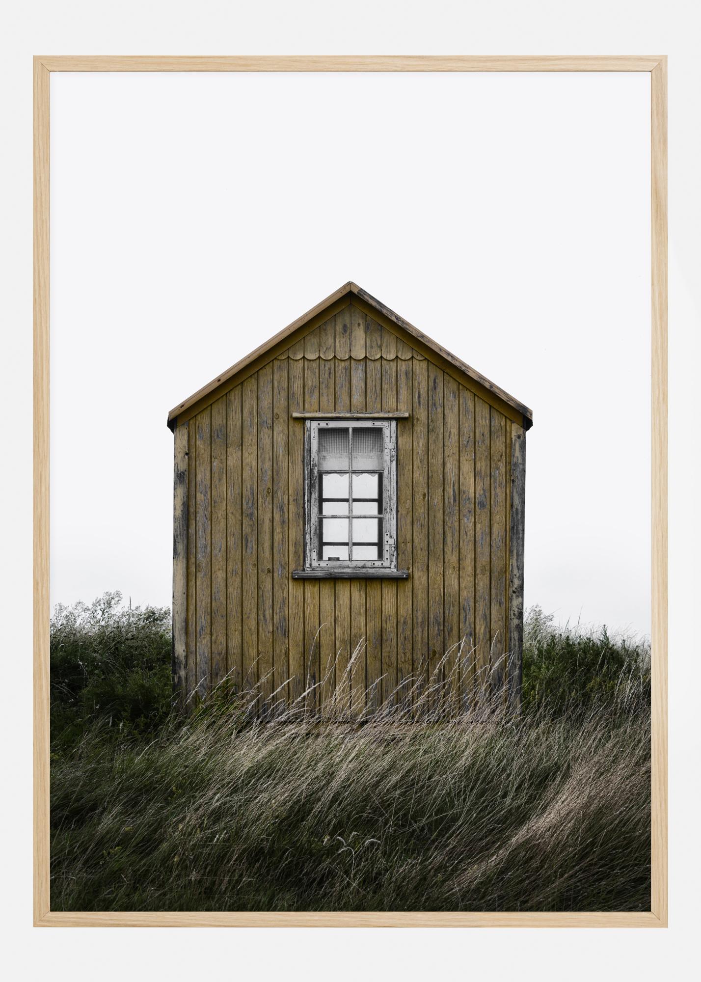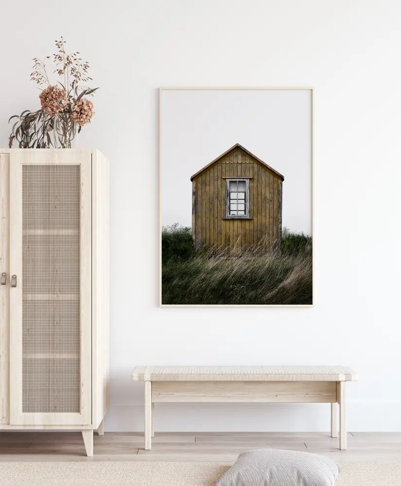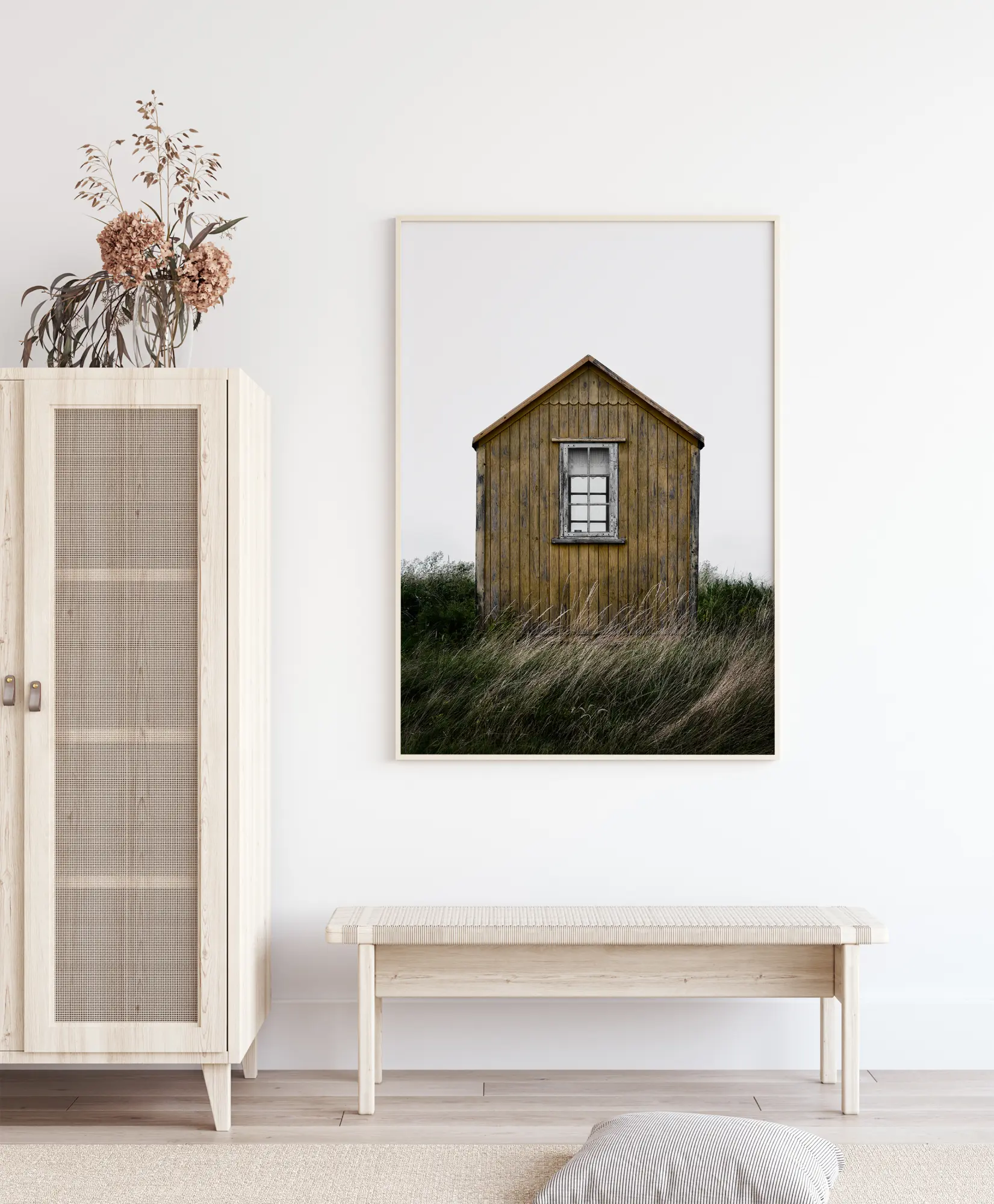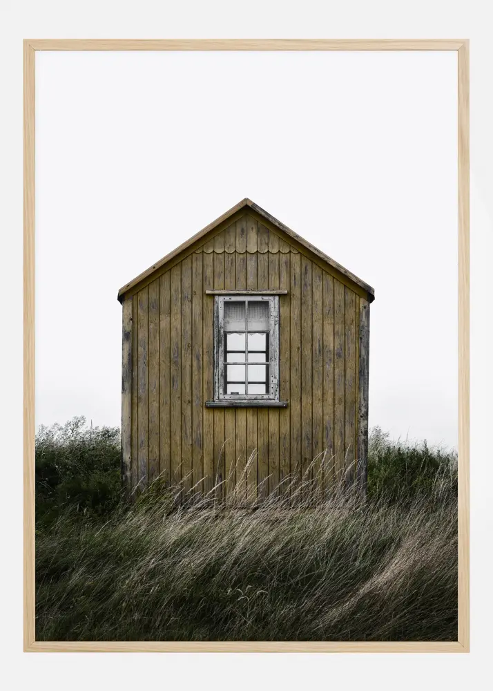 Elegantiškas kraštovaizdžio plakatas su paprasta medine paplūdimio trobele. Vieniša trobelė stovi ant vėjo nugairytų smėlėtų kopų ir žolės. Pajausti tą atvirumą ir laisvę, kai pakabinate šį savo namuose.