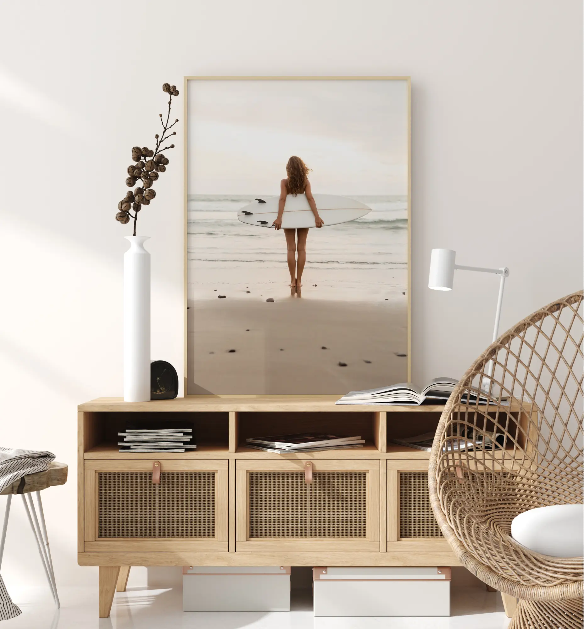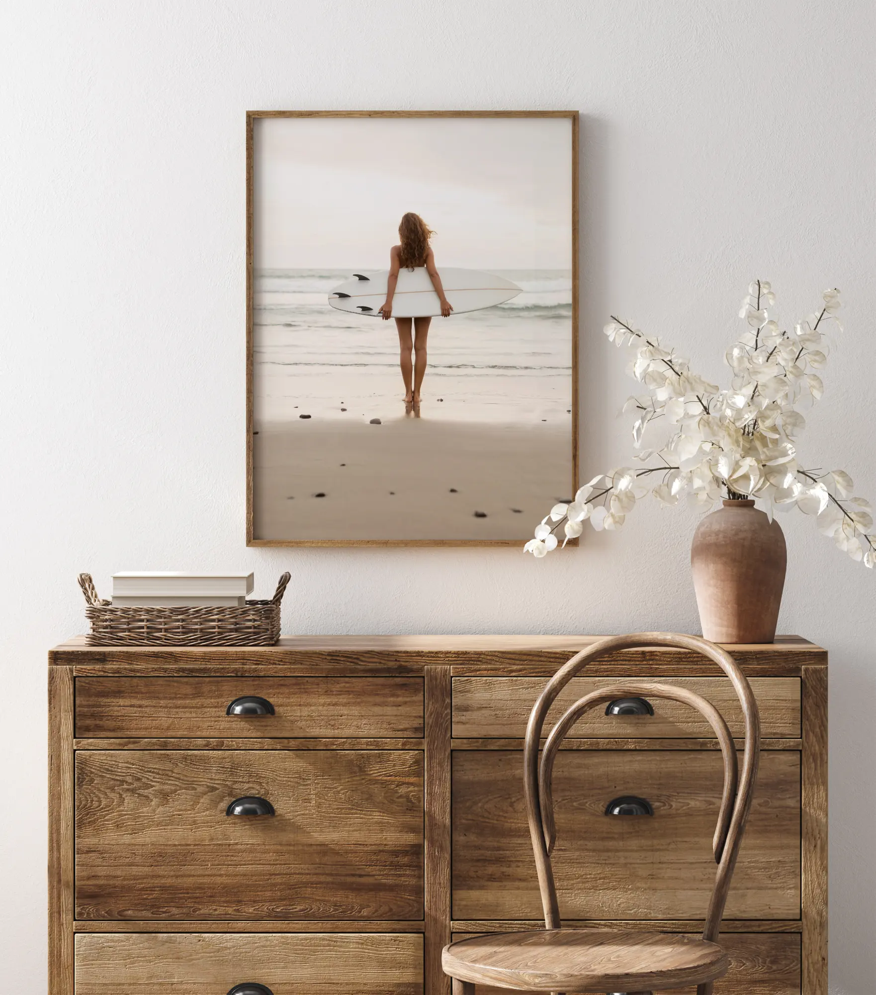 Nuostabi moters nuotrauka paplūdimyje, laikančios banglentę už nugaros, žvelgiančios į horizontą. Tikras geros nuotaikos plakatas su švelniais tonais ir formomis. Tinka daugumai namų ir interjero stilių.