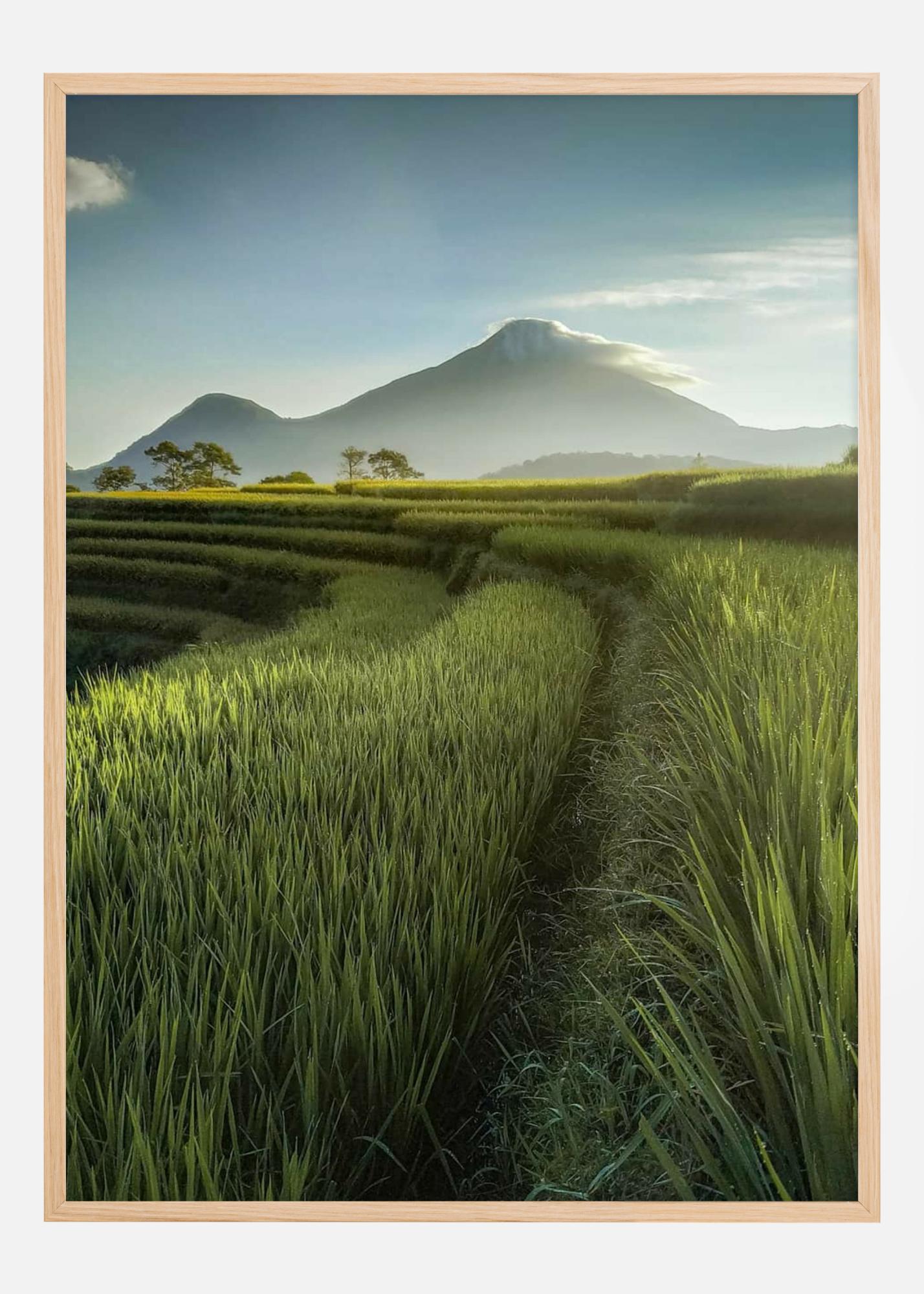 Šis plakatas siūlo vaizdą į pastorališka idyllę, kur žali ryžių laukai tęsiasi link didingų kalnų su minkštu dangumi fono. Šviesa, nukritusi ant kraštovaizdžio, suteikia šiltą ir jaukų jausmą, todėl ši nuotrauka tampa puikiu būdu įnešti gamtos ramybę ir grožį į jūsų namus ar darbo vietą.