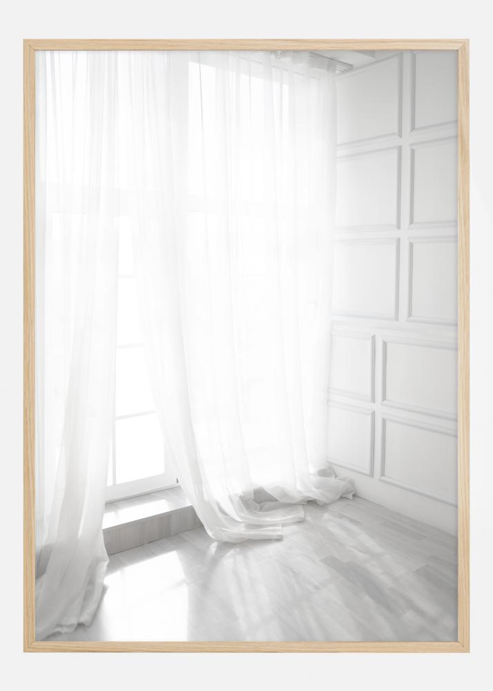 Šis ramus ir valantis plakatas vaizduoja tylų kambario kampą, uždengtą permatomomis baltomis užuolaidomis. Šviesa, prasiskverbianti pro audinį, sukuria šešėlių ir atspalvių žaismą ant blizgančių grindų, suteikianti ramybės ir aiškumo jausmą. Šis minimalistinis atspaudas išreiškia tylą ir puikiai tiks aplinkoje, siekiančioje paprastumo ir ramybės.