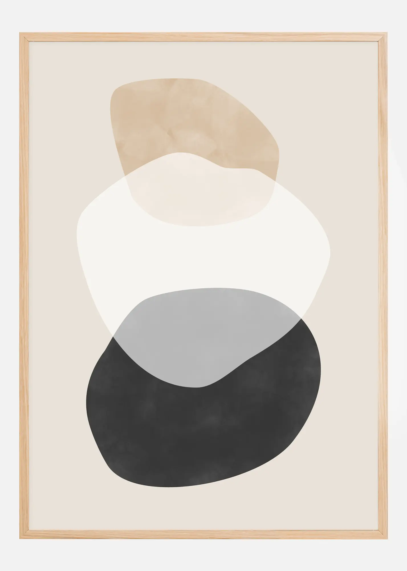 Šis meninis plakatas spinduliuoja ramia ir modernia estetika, puikiai tinkančia šiuolaikiniams namams ar biurui. Su minimalistiniu dizainu, susidedančiu iš persidengiančių abstrakčių formų, šis motyvas siūlo harmoningą balansą tarp švelnių kontūrų ir subtilių spalvų kontrastų. Spalvų paletę sudaro smėlio, kremo, pilkos ir tamsios juodos atspalviai, kurie sukuria diskretišką, bet drąsų išraišką ant sienos. Paprastas, bet efektingas meno kūrinys yra subtili skandinaviško dizaino reprezentacija, idealiai tinkanti kurti atsipalaidavusią atmosferą bet kurioje patalpoje.