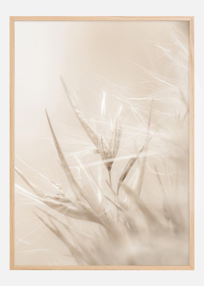 Šis plakatas yra trapumo ir stiprybės studija, augalijos gyvenimo ramybės būsenos detalės ir tekstūros, įamžintos vienos akimirkos tylume. Švelni smėlinė spalva ir subtilios džiovintų šiaudų detalės kuria svajingą atmosferą, kuri tuo pačiu metu yra ir atpalaiduojanti, ir estetiškai patraukli. Šis meno kūrinys atspindi nuostabius gamtos kontrastus, pabrėždamas jos subtilią, tačiau tuo pačiu metu pastovią prigimtį.