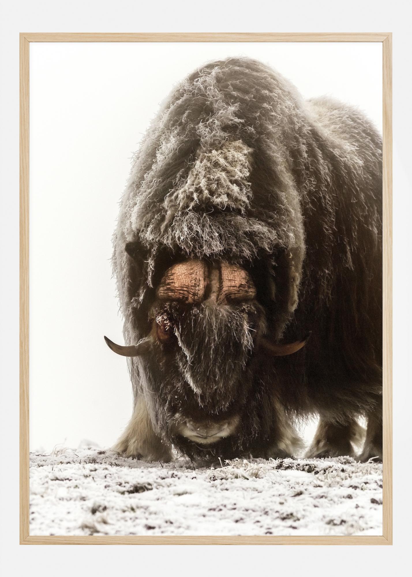 Laukinis plakatas su sniegu padengtu jak. Jako ilgi rudi kailiai atrodo švelnūs ir vešlūs, kai jis stovi atsisukęs į kamerą ir ieško maisto. Snieguotas fonas išryškina jį ir suteikia šiek tiek dramatiškumo vaizdui. Pakabinkite jį ant sienos, kad suteiktumėte žiemišką pojūtį.