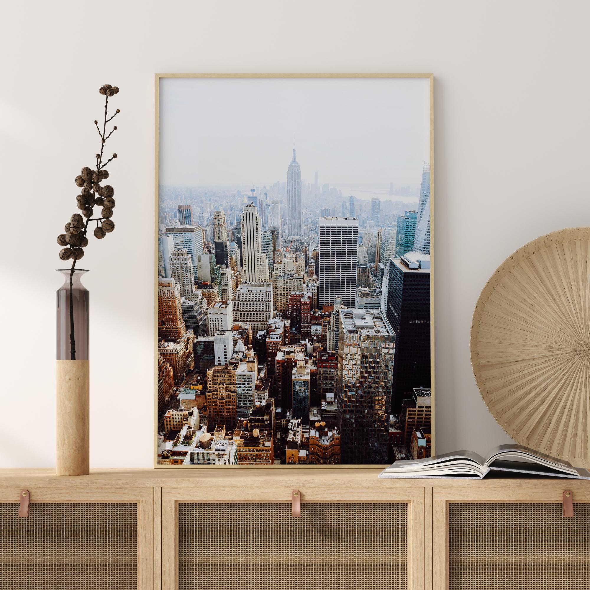 Oro vaizdas iš paukščio skrydžio į Niujorko centrą su Empire State Building tolumoje. Priekyje esančios spalvos prasideda nuo aukso ir geltonos, kol fone susilieja į šaltesnius mėlynus ir pilkus atspalvius. Vaizdo mažėjantis fokusas sukuria gylį. Parsineškite šį kūrinį namo ir mėgaukitės meniniu miesto gyvenimo išraiškumu.