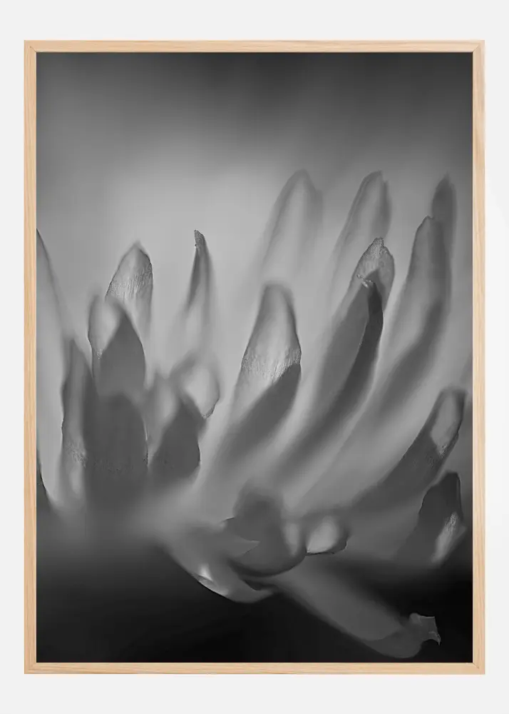 Šis nuotaikingas ir meniškas plakatas vaizduoja stambų gėlės planą juodai baltame fone, kur šviesa ir šešėliai žaidžia ant žiedlapių paviršių, sukurdami gilų ir dramatišką efektą. Supaprastinta spalvų paletė pabrėžia minkštas gėlės kreives ir subtilią faktūrą, perteikia nesenstančią eleganciją vaizdui.
