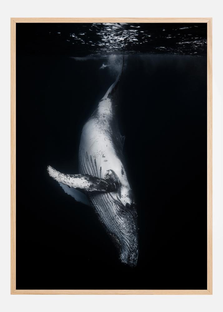 Šioje iliustruotoje plakato versijoje pavaizduotas kuprotasis banginis, grakščiai slystantis tamsiais vandenimis, vaizdas, atspindintis jūros gyvenimo esmę. Kontrastinga nespalvota kompozicija pabrėžia banginio tekstūrizuotą odą ir elegantiškus kūno kontūrus, sukurdama stiprų ramybės ir malonės vaizdą po paviršiumi.