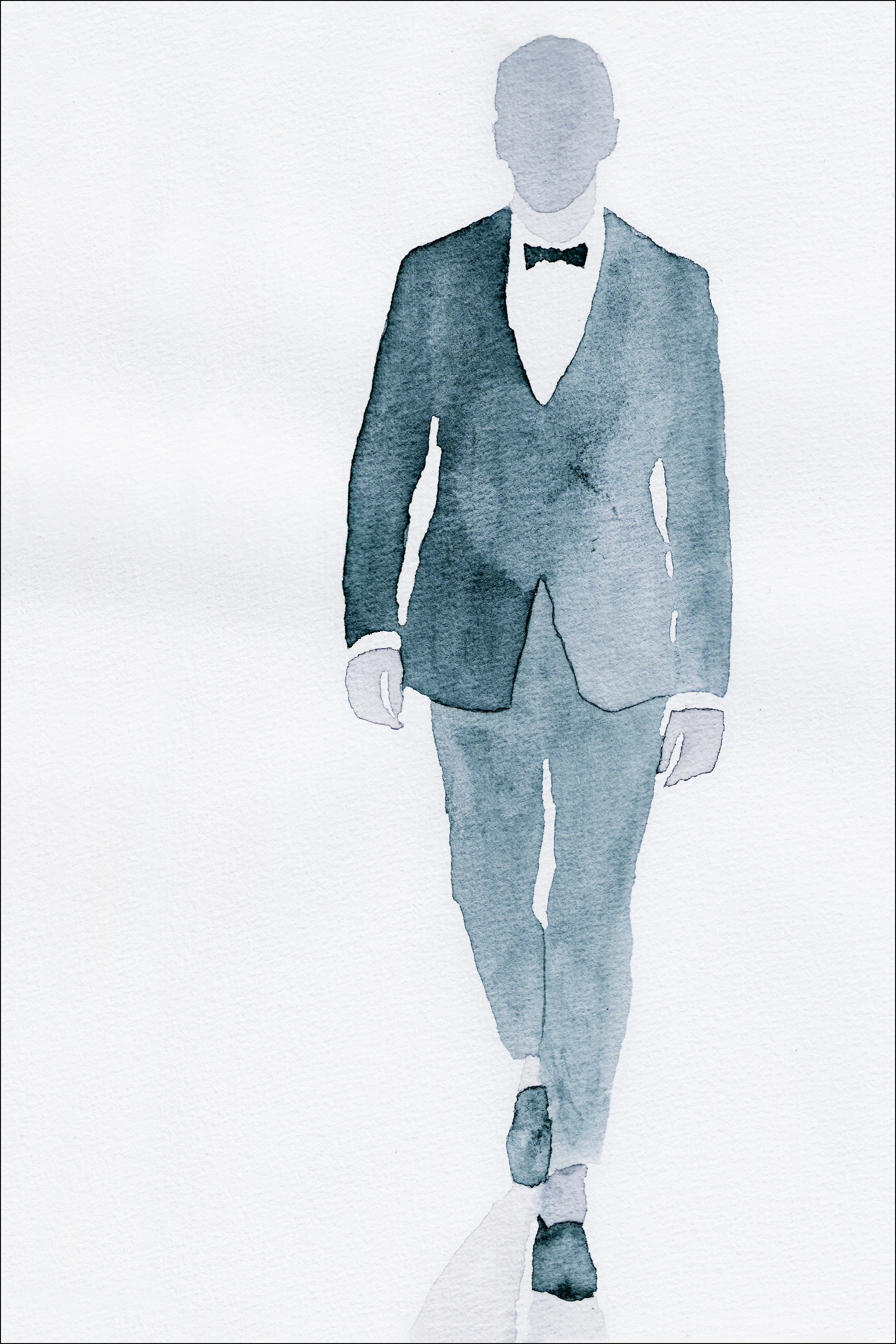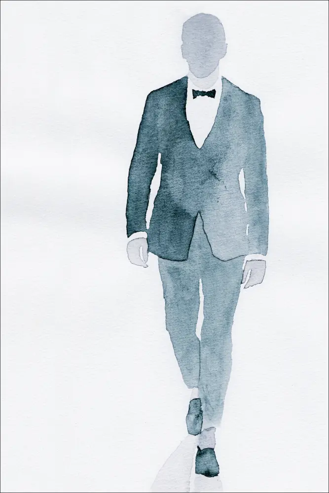 Portretinis plakatas su vyru, vilkinčiu smokingą, einančiu. Paprastas, bet efektingas, šis mėlynas paveikslas vaizduoja figūrą, bet nerodo jokių detalių. Kas tas paslaptingas vyras? Jums yra spręsti, kai pakabinsite paveikslą namuose.