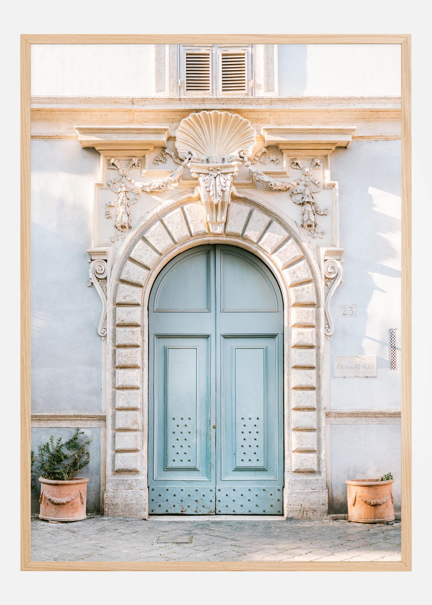 Šis plakatas atspindi klasikinės europinės architektūros grožį ir žavesį. Šviesiai mėlynos dvigubos durys yra apsuptos elegantiška akmenine angomis, su išskirtiniais drožiniais ir ornamentais, kurie suteikia istorinės prabangos ir kultūrinio paveldo jausmą. Virš durų yra įspūdingas kriauklės formos skliautas, užbaigiantis šį didingą įėjimą. Iš abiejų durų pusių yra vazonai su žaliais augalais, kurie suteikia natūralią ir gyvą kontrastą akmeninei fasadei. Šis vaizdas spinduliuoja ramybės ir iškilumo atmosferą, puikiai tinkamą kiekvieniems namams suteikti klasikinio grožio elementą.