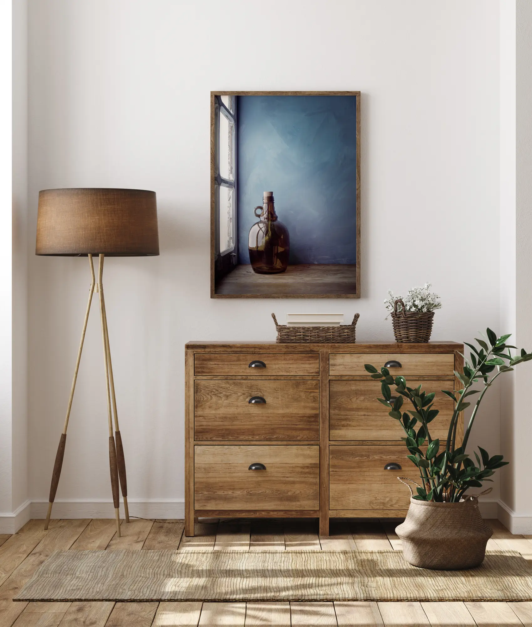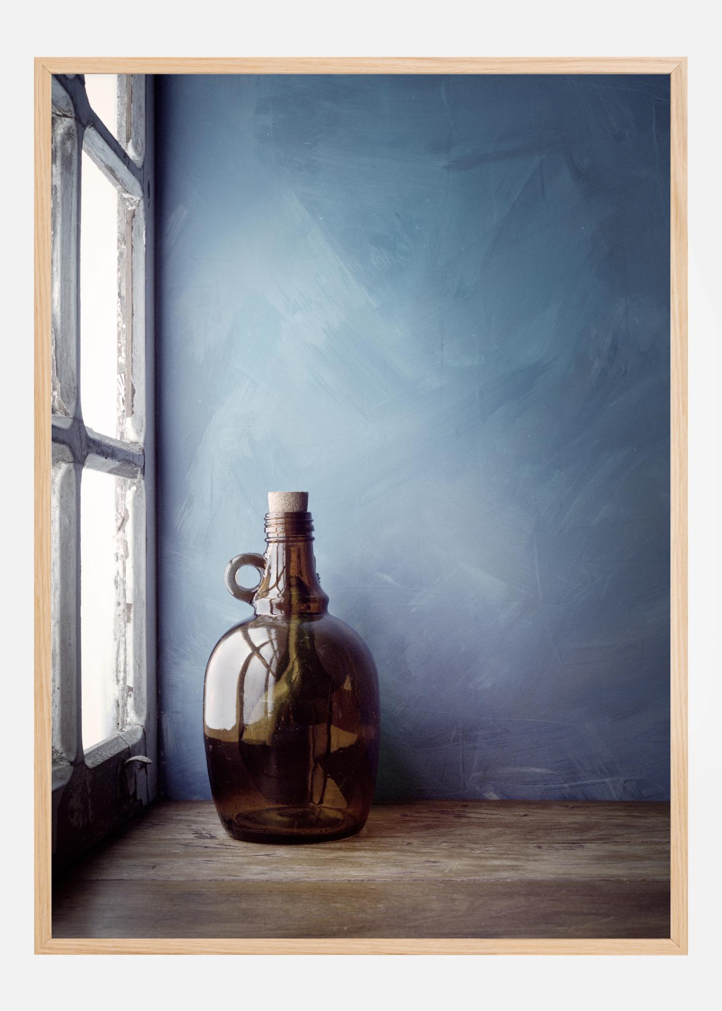 Natiurmorto plakatas su rudu buteliu prieš mėlyną sieną. Šviesa iš lango šviečia iš kairės, apšviesdama butelį, kuris sukelia atspindžius. Paruoškite savo namus kaimiškai atmosferai su švelniai mėlyna siena ir senoviniu mediniu stalu, ant kurio stovi butelis.