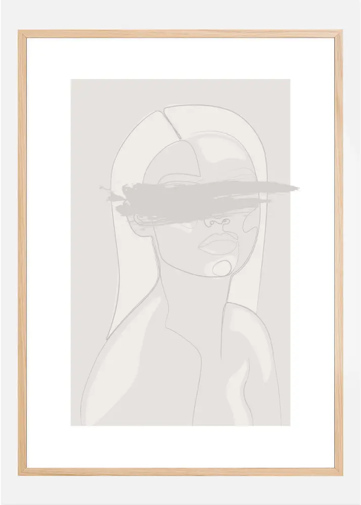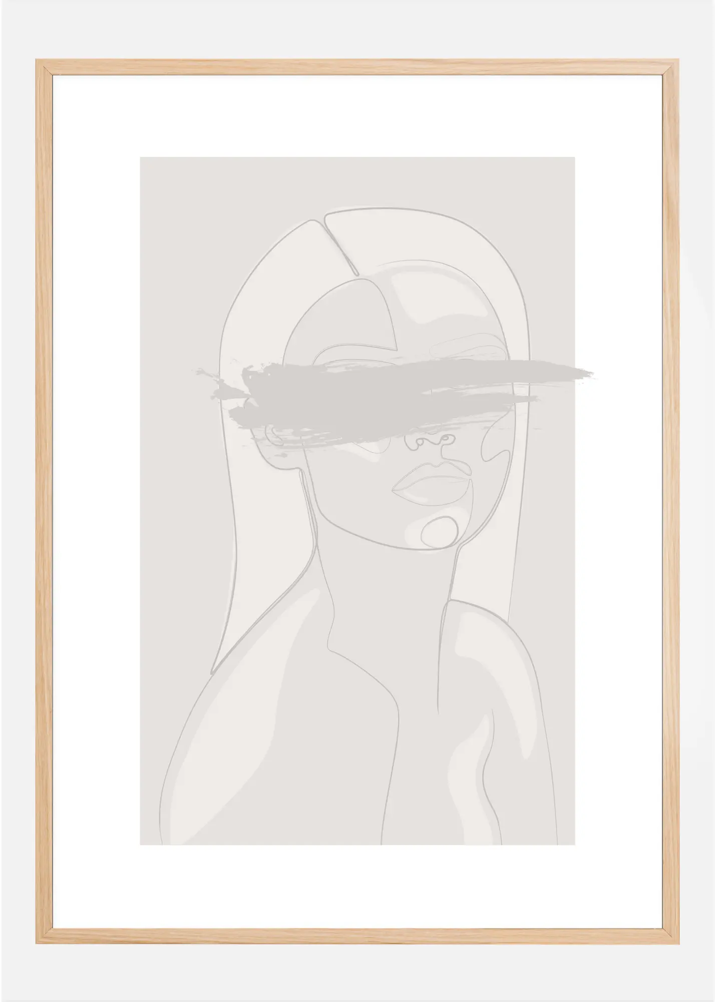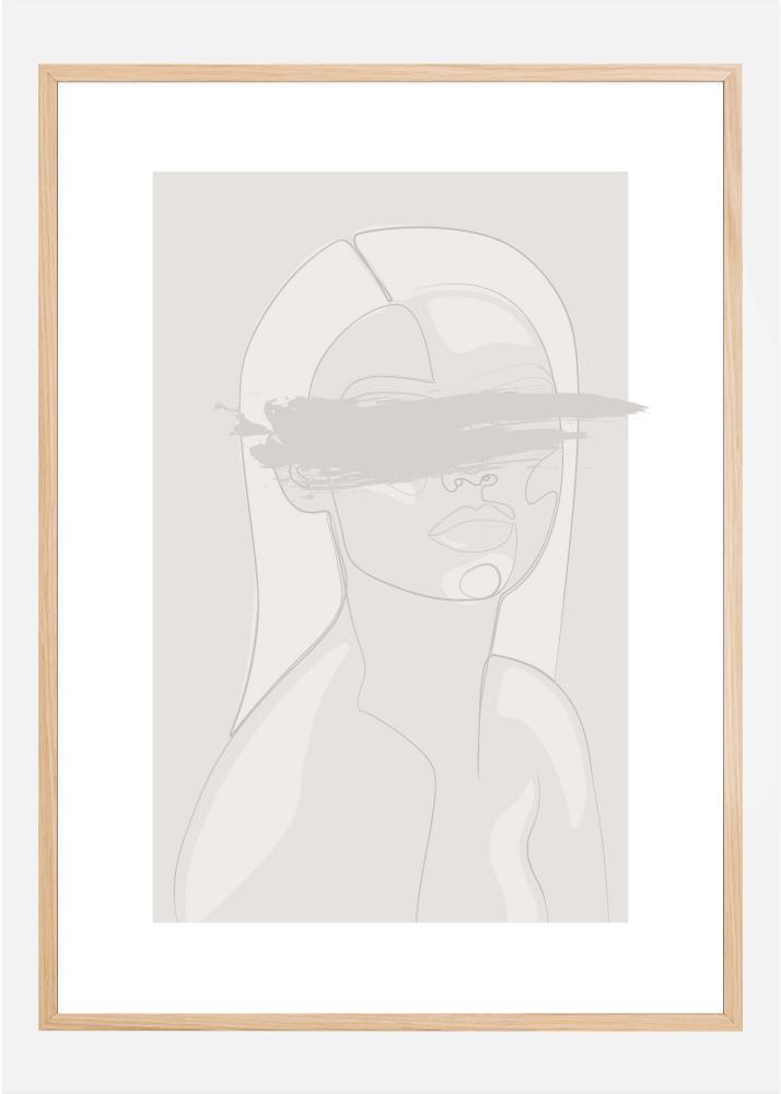 Abstraktus plakatas su moterimi uždengtomis akimis. Šis blyškios baltos ir pilkos spalvos atvaizdas parodo moters galvą ir pečius blokų formomis ir linijomis. Spalvų ruožas dengia akis, sukuriant moters paslaptį. Stipri balta rėmelis įrėmina ją, puikiai tinka pakabinti ant drąsiai spalvotos sienos namuose.
