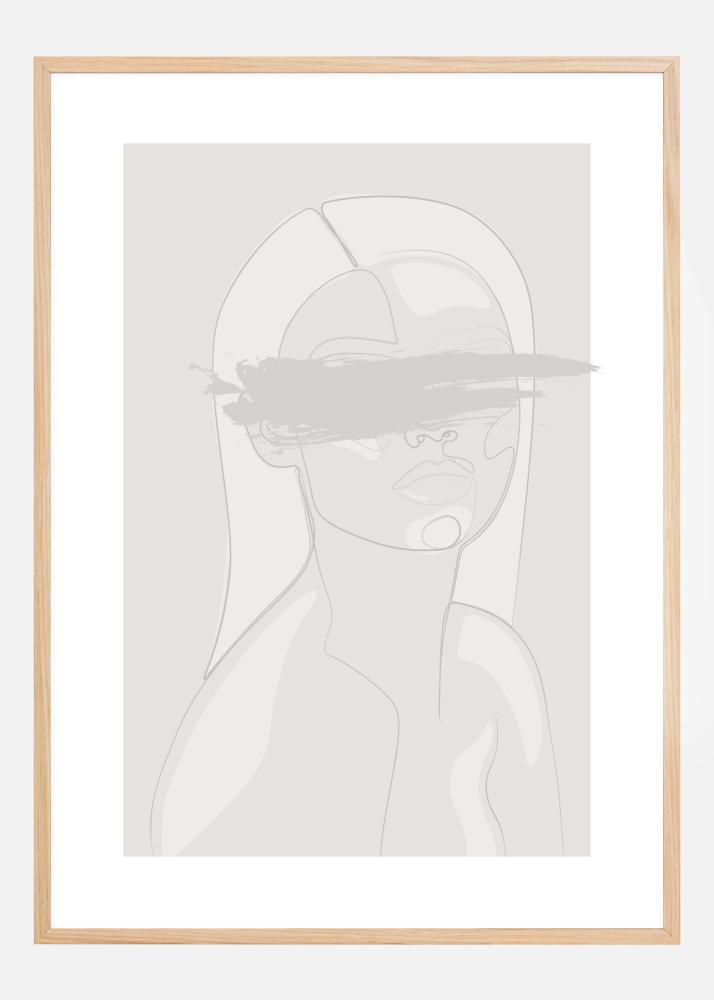 Abstraktus plakatas su užmerktomis moters akimis. Šis blyškus baltas ir pilkas vaizdas vaizduoja moters galvą ir pečius blokų formose ir linijose. Spalvų pliūpsnis dengia akis, sukuriant paslaptį aplink moterį. Stipri balta rėmo linija ją apibrėžia, puikiai tinka kabinti ant drąsiai nuspalvintos sienos namuose.