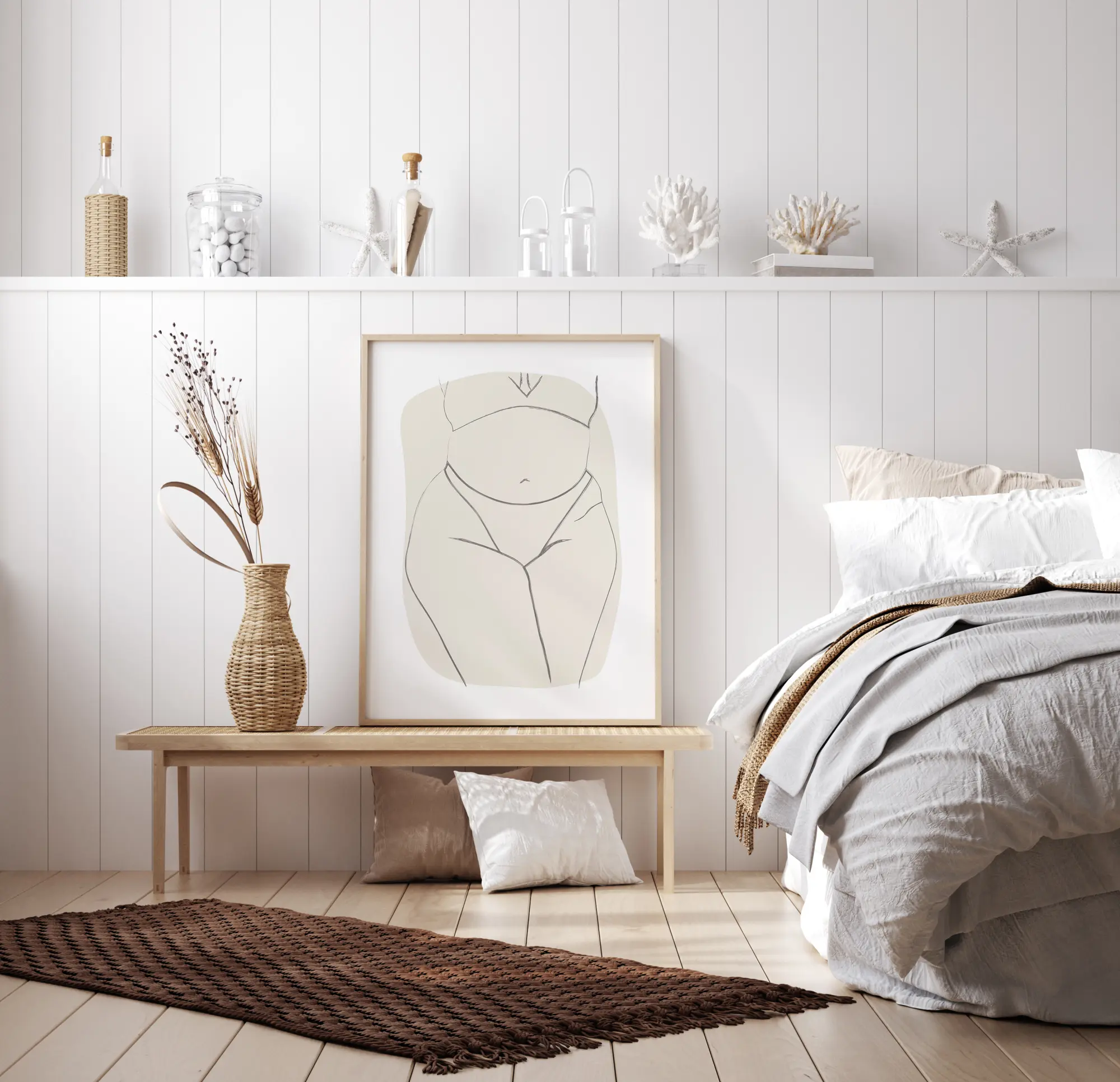 Paprastas plakatas su moters pilvo ir kojų piešiniu. Kukliai rodomos linijos žymi moters sukryžiuotas kojas, kai ji dėvi paprastą bikinį. Pažymėtos šviesiai pilkos spalvos, stiprios linijos išsiskiria ir kuria menišką kūrinį. Suderinkite vaizdą su spalvota siena, kad pasiektumėte geriausią efektą.