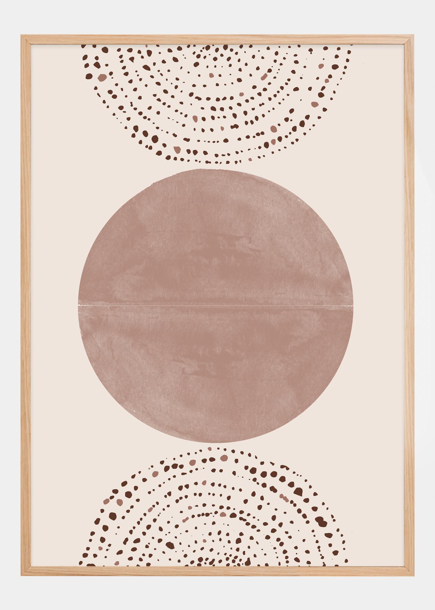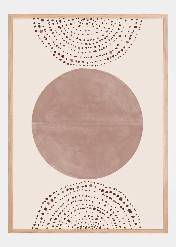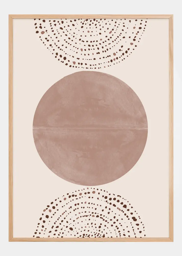 Ši rafinuota ir raminanti plakatas pabrėžia didelį, švelniai terakotos spalvos apskritimą, kuris yra kompozicijos centre, su smulkiomis, išbarstytomis dėmėmis, kurios formuoja plūduriuojančias pusapskrites viršuje ir apačioje. Šis motyvas įkvėptas bohemiško dizaino ir suteikia atsipalaidavusį, žemišką jausmą, tuo pačiu pridedant modernų prisilietimą kambariui, kurį jis puošia.